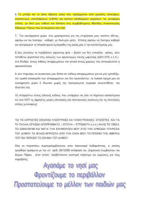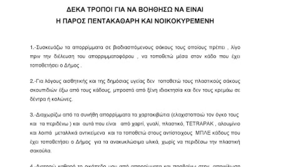 Η Υπηρεσία Καθαριότητας, Ανακύκλωσης & Πρασίνου του Δήμου Πάρου, με το υπάρχον προσωπικό καταβάλλει καθημερινά φιλότιμες προσπάθειες για να κρατηθεί καθαρό το νησί μας.
