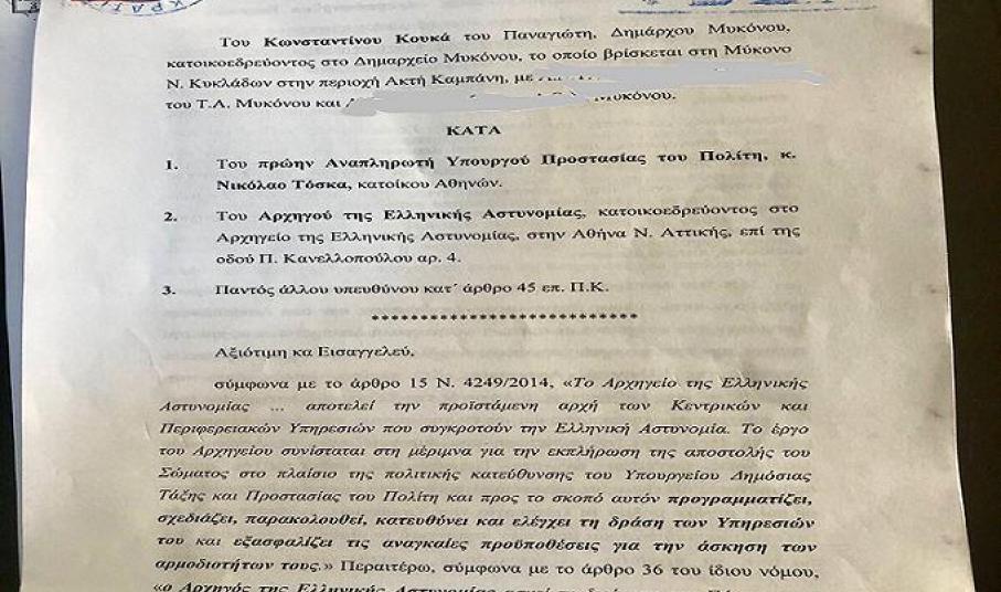 Με μήνυση κατά του πρώην υπουργού Προστασίας του Πολίτη, Νίκου Τόσκα και του αρχηγού της ΕΛ.ΑΣ, απαντά ο Δήμαρχος Μυκόνου, Κωνσταντίνος Κουκάς, στη συνεχιζόμενη υποστελέχωση του Αστυνομικού Τμήματος του νησιού, παρά το πλήθος των σχετικών αιτημάτων ενίσχυσης του, γεγονός που επιτρέπει την εκδήλωση παραβατικών συμπεριφορών και αυξανόμενων κρουσμάτων βίας.