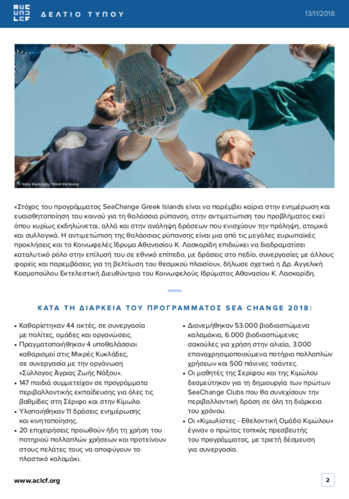 Το περιβαλλοντικό πρόγραμμα SEACHANGE GREEK ISLANDS 2018 του Κοινωφελούς Ιδρύματος Αθανασίου Κ. Λασκαρίδη πραγματοποιήθηκε σε δέκα νησιά των Κυκλάδων, υπό την αιγίδα των τοπικών Δήμων και σε συνεργασία με κατοίκους, οργανώσεις και φορείς. Με βασικό μήνυμα «Είμαι η αλλαγή!», το πρόγραμμα ξεκίνησε τον Μάιο από τη Σίκινο, κάνοντάς την τον πρώτο #plastic_straw_free Δήμο της χώρας. Συνεχίστηκε με επιτυχία μέχρι τον Οκτώβριο στη Σέριφο, την Κίμωλο, την Ανάφη, την Αμοργό, τη Φολέγανδρο, την Ηρακλειά, τη Δονούσα, τη Σχοινούσα και στα Κουφονήσια.