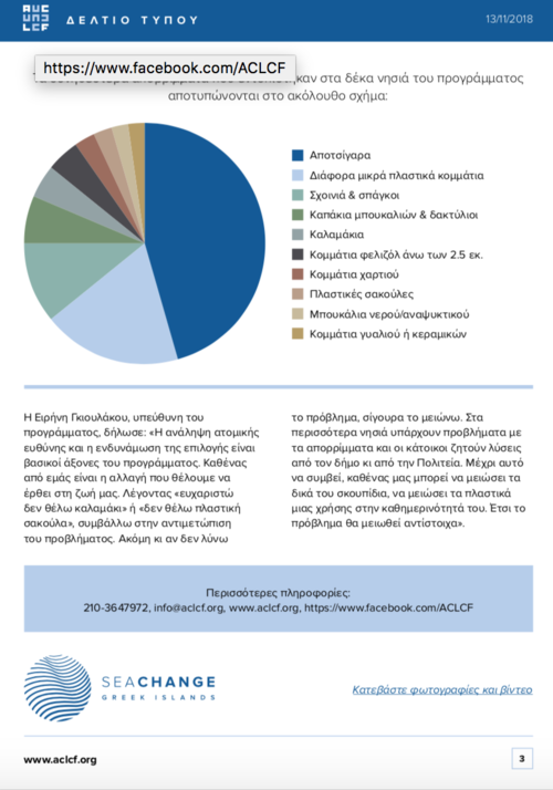 «Στόχος του προγράμματος SeaChange Greek Islands είναι να παρέμβει καίρια στην ενημέρωση και ευαισθητοποίηση του κοινού για τη θαλάσσια ρύπανση, στην αντιμετώπιση του προβλήματος εκεί που κυρίως εκδηλώνεται, αλλά και στην ανάληψη δράσεων που ενισχύουν την πρόληψη, ατομικά και συλλογικά. Η αντιμετώπιση της θαλάσσιας ρύπανσης είναι μια από τις μεγάλες ευρωπαϊκές προκλήσεις και το Ίδρυμα Αθανασίου Κ. Λασκαρίδη επιδιώκει να διαδραματίσει καταλυτικό ρόλο στην επίλυσή του σε εθνικό επίπεδο, με δράσεις στο πεδίο, συνεργασίες με άλλους φορείς και παρεμβάσεις για τη βελτίωση του θεσμικού πλαισίου», δήλωσε σχετικά η Δρ. Αγγελική Κοσμοπούλου Εκτελεστική Διευθύντρια του Κοινωφελούς Ιδρύματος Αθανασίου Κ. Λασκαρίδη.