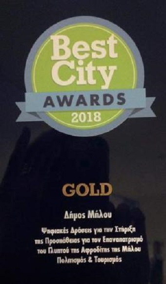 Με το χρυσό βραβείο «best city award» τιμήθηκε ο Δήμος Μήλου για τις Ψηφιακές Δράσεις για την στήριξη της καμπάνιας «TAKE ME HOME» που αφορούν στη διεκδίκηση της Αφροδίτης από το Μουσείο του Λούβρου.
