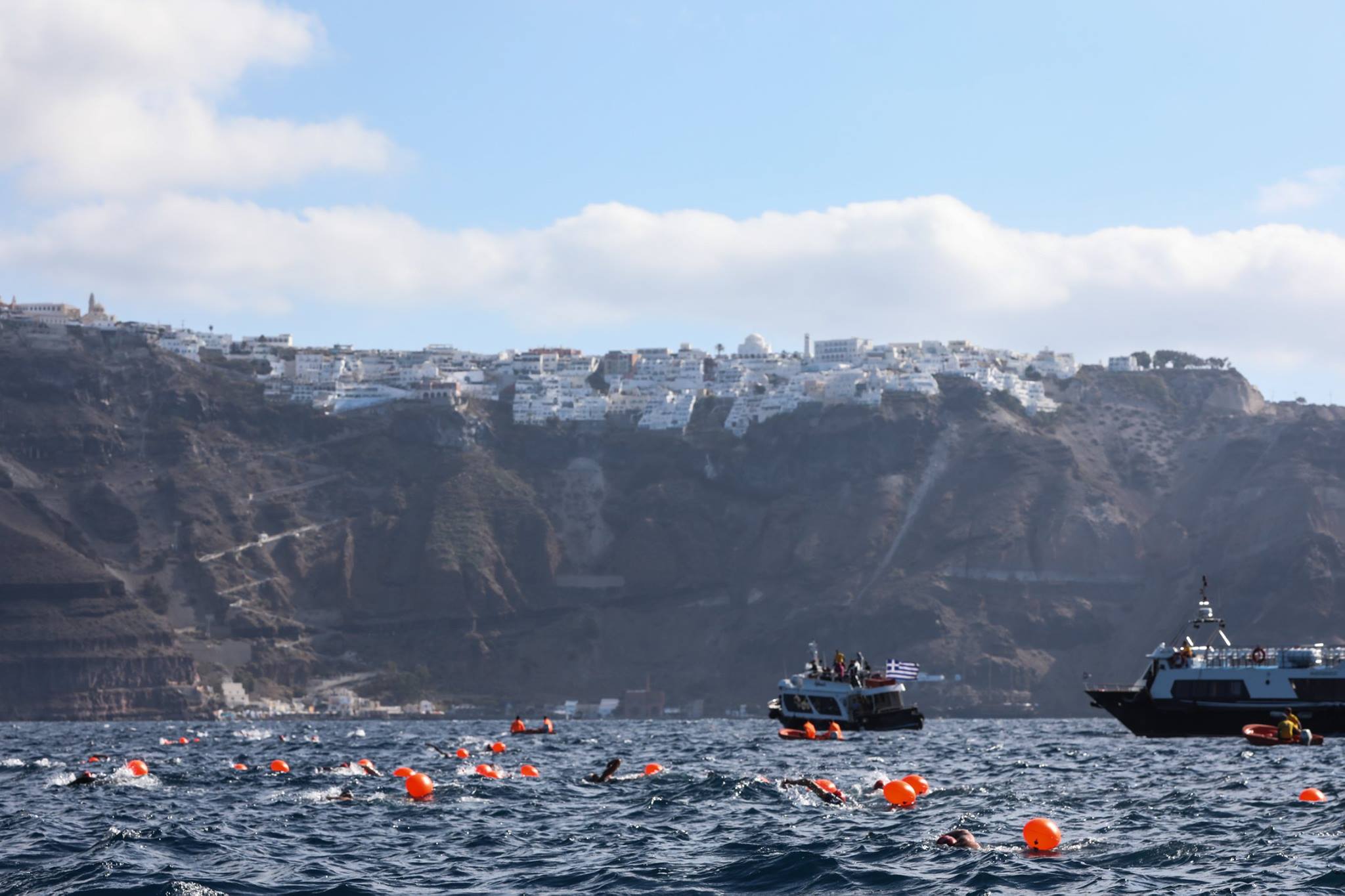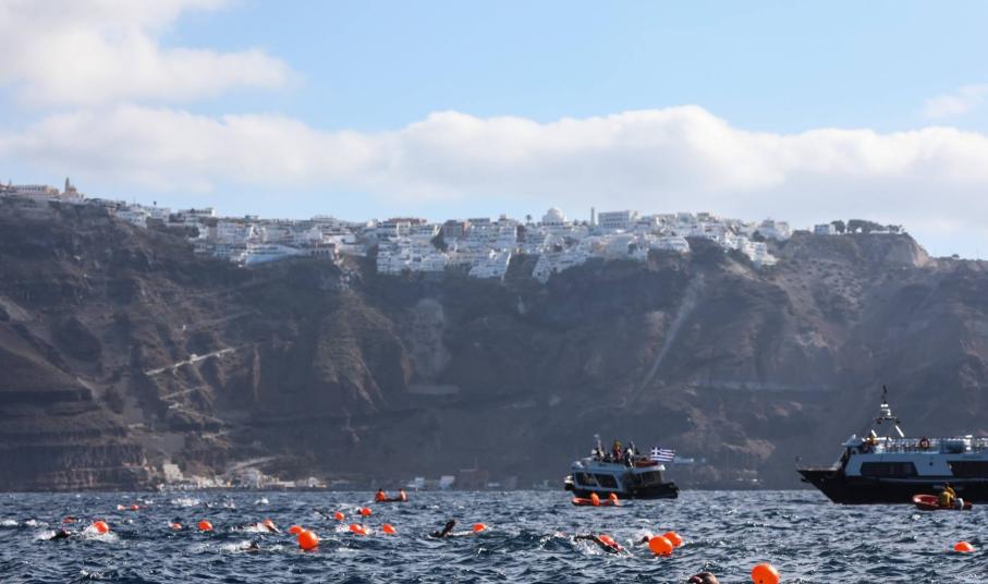 Η κολύμβηση open water θα έχει και αυτή την χρονιά την τιμητική της. Συγκεκριμένα, οι συμμετέχοντες θα έχουν την ευκαιρία να κολυμπήσουν από το ηφαίστειο έως το παλιό λιμάνι των Φηρών, έχοντας την επιβλητική όψη του νησιού μπροστά τους, στον αγώνα 1,5 μιλίου (2,4 χλμ.). Η διοργάνωση θα φροντίσει τους ερασιτέχνες αθλητές με την προσθήκη του σωσιβίου ασφαλείας, υψηλών προδιαγραφών και ποιότητας, το οποίο δίνει ένα ακόμα κίνητρο στον συμμετέχοντα να επιλέξει το “Santorini Experience”. Η κολυμβητική διαδρομή θα διεξαχθεί, όπως και κάθε χρόνο, με απόλυτη ασφάλεια στα μαγευτικά νερά της Σαντορίνης (μέση θερμοκρασία νερού στους 20-22 βαθμούς Κελσίου), υπό την τεχνική διεύθυνση του Ομοσπονδιακού Τεχνικού, με Ολυμπιακές & Παγκόσμιες διακρίσεις στην κολύμβηση ανοιχτής θαλάσσης, Νίκου Γέμελου που έχει σχεδιάσει την μοναδική αυτή διαδρομή. Στην ασφάλεια του αγώνα θα συμβάλλουν για ακόμα μία χρονιά οι εξειδικευμένοι ναυαγοσώστες και τα ναυαγοσωστικά σκάφη. Για τους κολυμβητές θα διαμορφωθούν διαφορετικές κατηγορίες ανάλογα με τον τελικό αριθμό των συμμετεχόντων κολυμβητών, ενώ θα υπάρχει και ξεχωριστή κατηγοριοποίηση για όσους φορούν ολόσωμη φόρμα κολύμβησης (wetsuit κατηγορία).