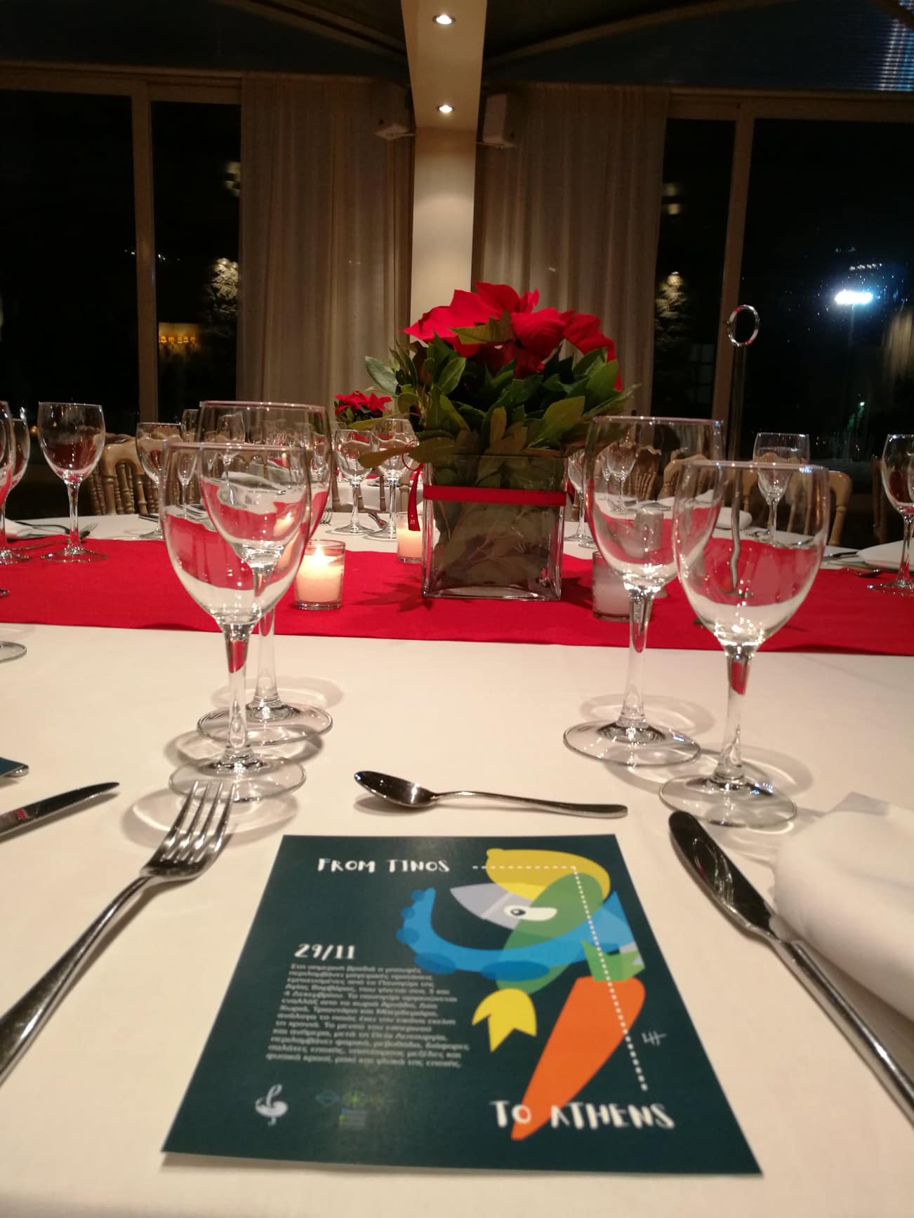 Οι προσκεκλημένοι της βραδιάς απόλαυσαν ένα αντίστοιχο μενού με άφθονο κρασί, τηνιακών οινοποιών και μπύρα της μικροζυθοποιίας του νησιού.