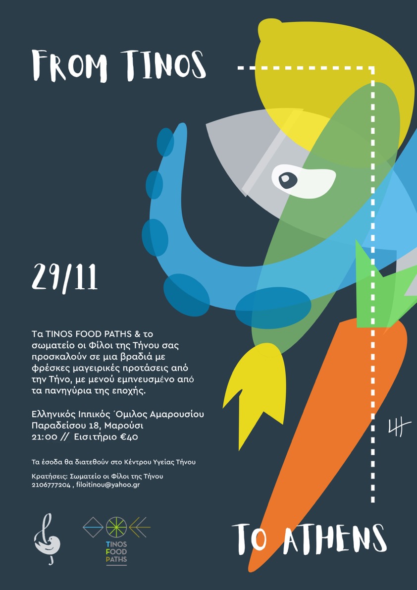 Το μη κερδοσκοπικό Σωματείο «ΟΙ ΦΙΛΟΙ ΤΗΣ ΤΗΝΟΥ» και η πρωτοβουλία δράσης των «TINOS FOOD PATHS», με κοινό κίνητρο την αγάπη τους και την προσφορά προς το νησί, οργάνωσαν ένα δείπνο στον Ιππικό Όμιλο Αμαρουσίου την Πέμπτη 29 Νοεμβρίου 2018, με σκοπό τα έσοδα της βραδιάς να προσφερθούν στο Κέντρο Υγείας Τήνου.