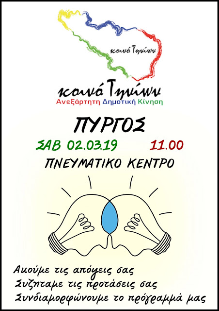 Και σε αυτές τις εκλογές διαμορφώνουμε το πρόγραμμά μας μαζί σας στον Πύργο. Ακούμε τις απόψεις σας, συζητάμε τις προτάσεις σας και συνδιαμορφώνουμε το πρόγραμμά μας.