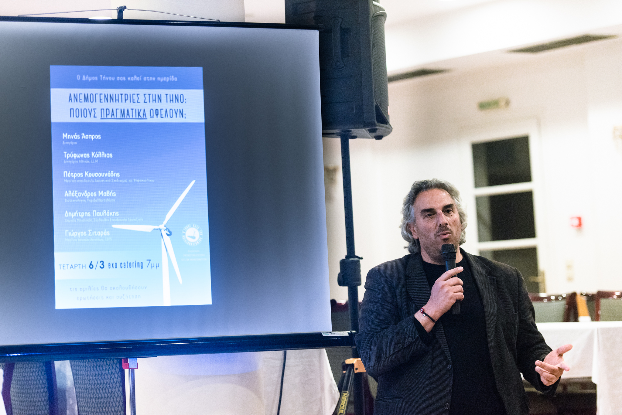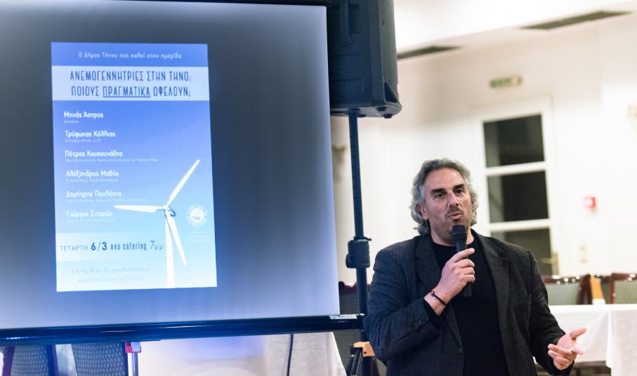 Πραγματοποιήθηκε την Τετάρτη 6 Μαρτίου στην κατάμεστη αίθουσα δεξιώσεων του exo catering, ημερίδα με θέμα «Ανεμογεννήτριες στην Τήνο: Ποιους πραγματικά ωφελούν;». Η ημερίδα διοργανώθηκε από την Συντονιστική Επιτροπή κατά των ΒΑΠΕ, η οποία διαχειρίζεται την σελίδα στο facebook «Η Τήνος κατά των Ανεμογεννητριών», με την συμπαράσταση και αρωγή του Δήμου Τήνου.