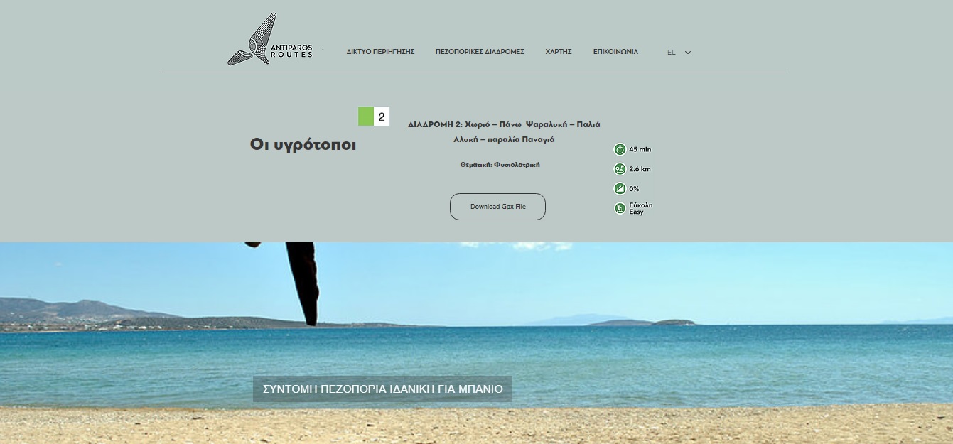 Όπως τόνισε η εκπρόσωπος του Δικτύου, δημιουργήθηκε ένα συνδυασμένο δίκτυο 45 χιλιομέτρων πεζοπορίας, αλλά και ποδηλασίας, καθώς οι διαδρομές της Αντιπάρου ενδείκνυνται και για τις δύο δραστηριότητες, το οποίο αποτελείται από παλιούς χωματόδρομους, που χρησιμοποιούνταν παλαιότερα για αγροτικές ή εξορυκτικές διαδικασίες και που δεν χρησιμοποιούνται καθόλου ή χρησιμοποιούνται σπανίως σήμερα από μηχανοκίνητα οχήματα.