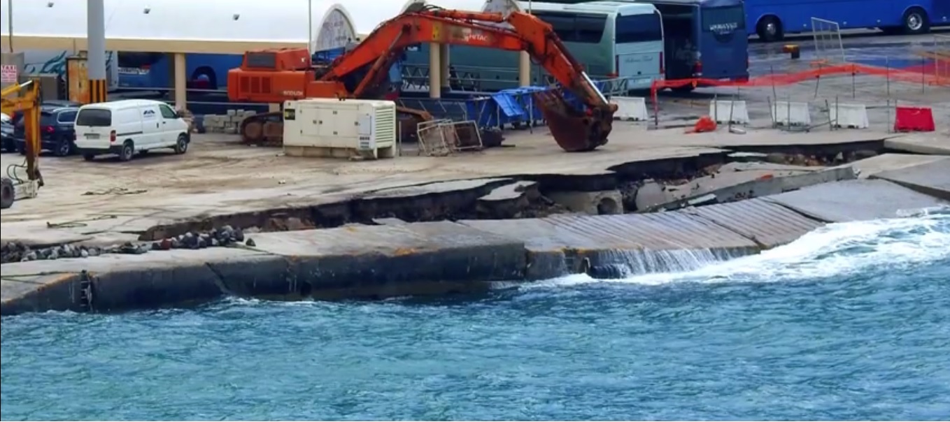 Μεγάλο μέρος του λιμένα του Αθηνιού “έπεσε” στο νερό, λόγω της καθίζησης που υπέστη, λόγω των έντονων καιρικών φαινομένων, που “χτύπησαν” το νησί τους τελευταίους μήνες, ενώ η ζημιά προκλήθηκε μόλις ένα μήνα μετά την έναρξη των εργασιών από τον εργολάβο, ο οποίος έχει αναλάβει το έργο της ανακατασκευής του λιμένα Θήρας, το οποίο χρηματοδοτείται από το Υπουργείο Μεταφορών και Υποδομών.