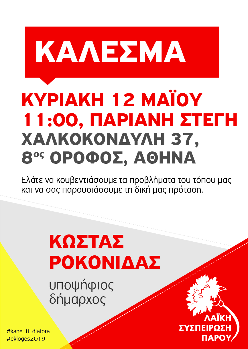 12 Μαΐου Κυριακή και ώρα 11 π.μ. θα μιλήσει ο υποψήφιος Δήμαρχος της Δημοτικής παράταξης ‘‘Λαϊκή Συσπείρωση Πάρου’’ κ. Κώστας Ροκονίδας