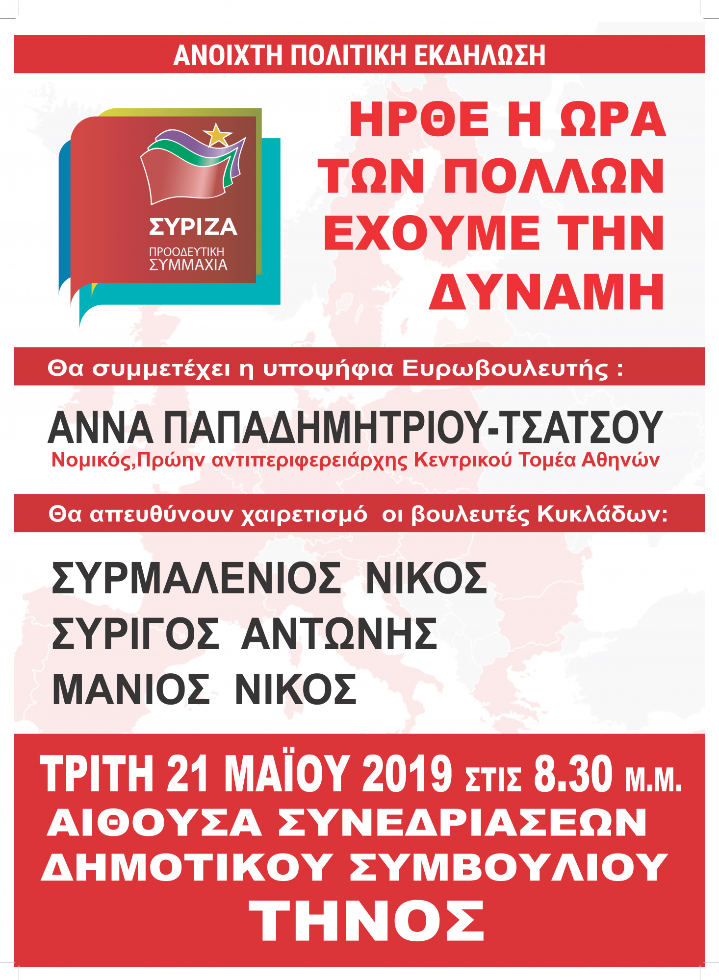 Ο ΣΥΡΙΖΑ – Προοδευτική Συμμαχία πραγματοποιεί ανοιχτή πολιτική εκδήλωση στην Τήνο, την Τρίτη 21 Μαΐου και ώρα 8:30΄ μ.μ., στην Αίθουσα Συνεδριάσεων Δημοτικού Συμβουλίου, με θέμα: «Ήρθε η ώρα των πολλών - Έχουμε τη δύναμη».