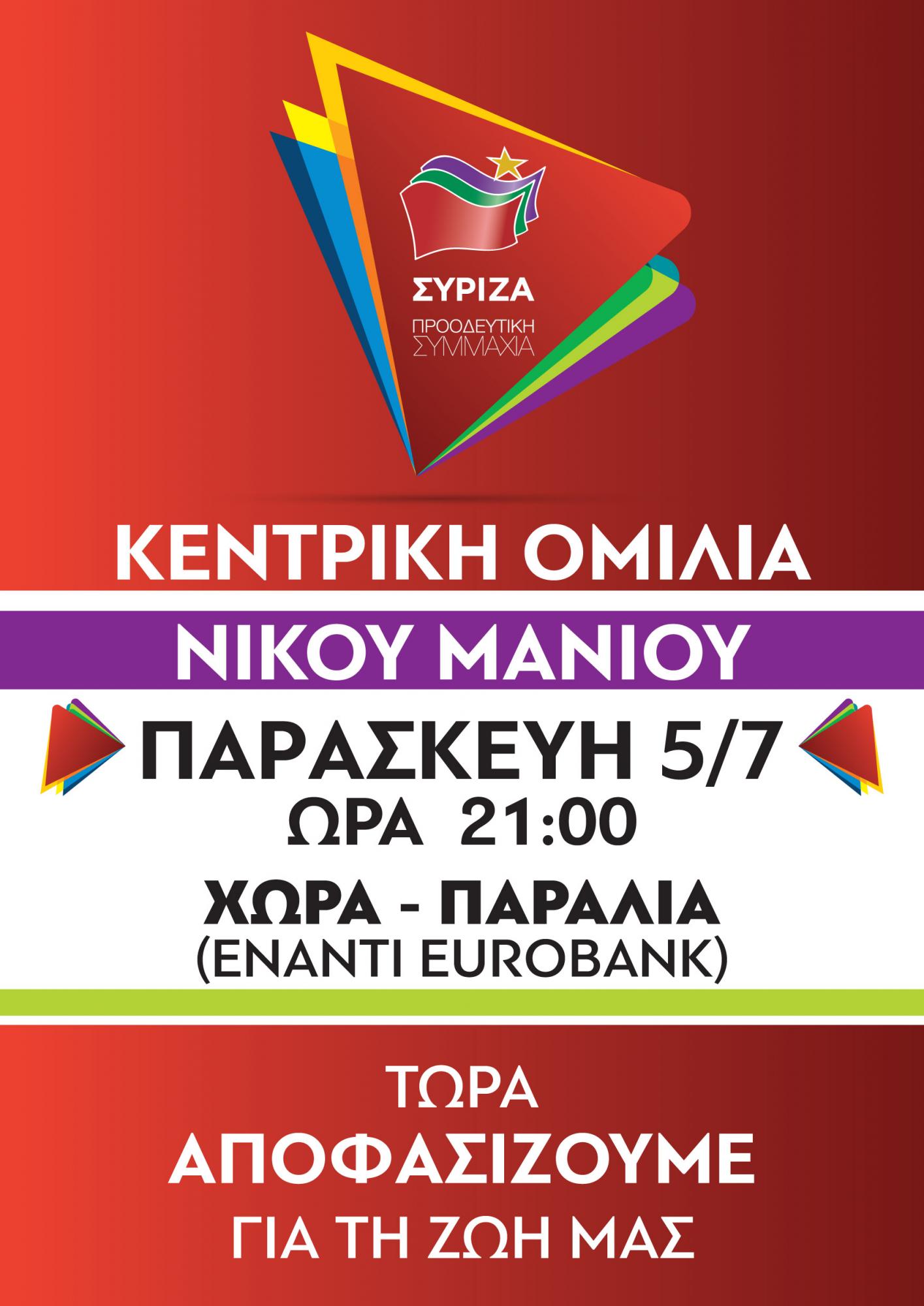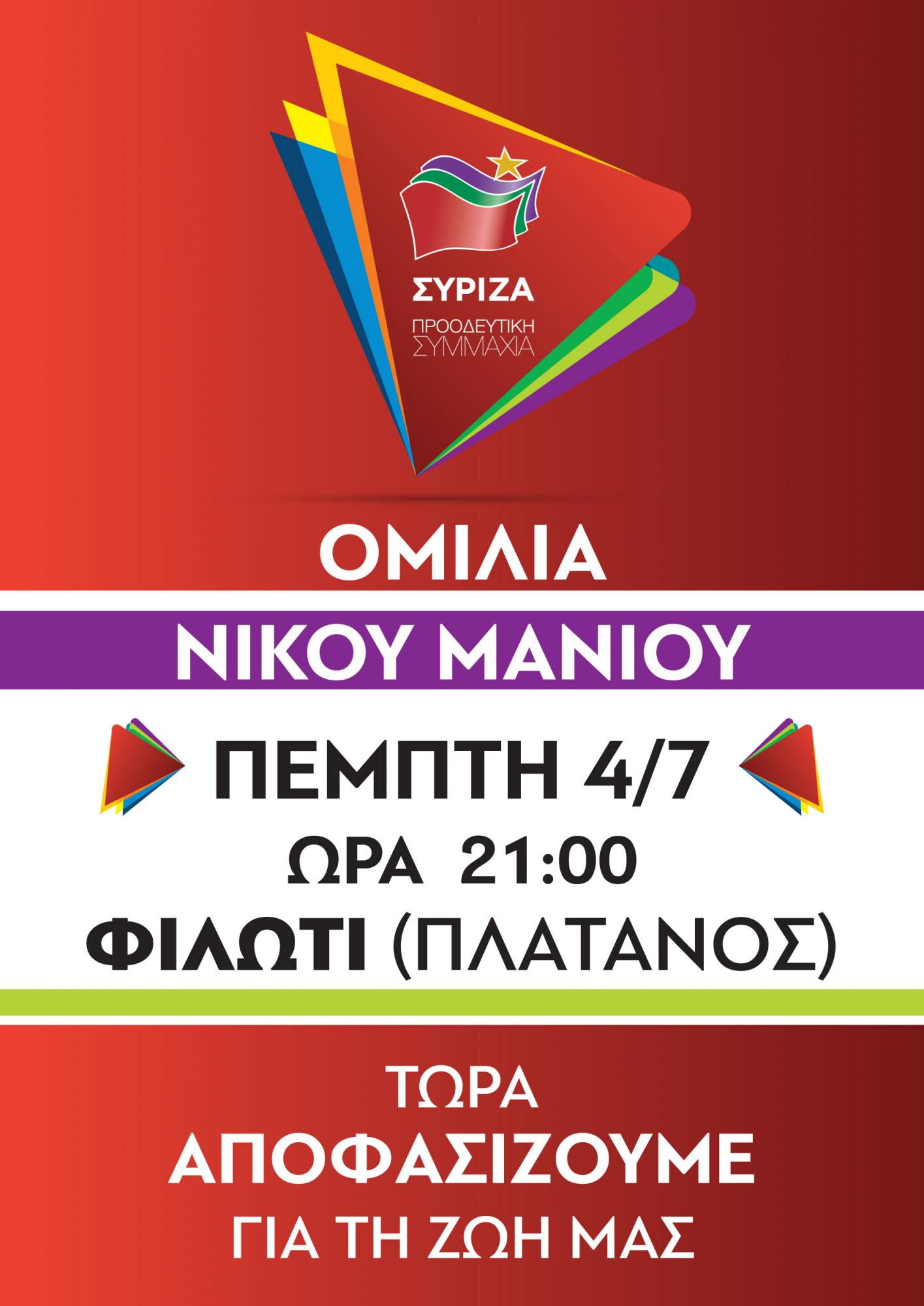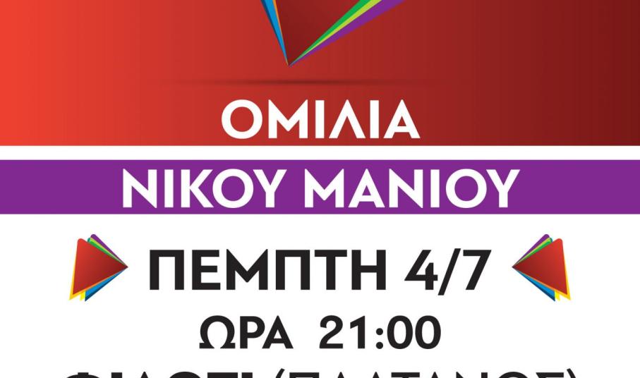 Ο υποψήφιος βουλευτής Κυκλάδων, Νίκος Μανιός θα είναι ο ομιλητής στις πολιτικές εκδηλώσεις του ΣΥΡΙΖΑ - Προοδευτική Συμμαχία, που θα πραγματοποιηθούν σήμερα και αύριο στη Νάξο.