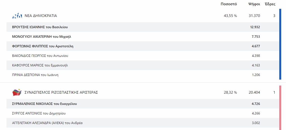 Συγκεκριμένα, το κόμμα της Νέας Δημοκρατίας εκλέγει τρεις βουλευτές (Γιάννης Βρούτσης, Κατερίνα Μονογυιού και Φίλιππος Φόρτωμας) και ο ΣΥΡΙΖΑ έναν (Νίκος Συρμαλένιος).