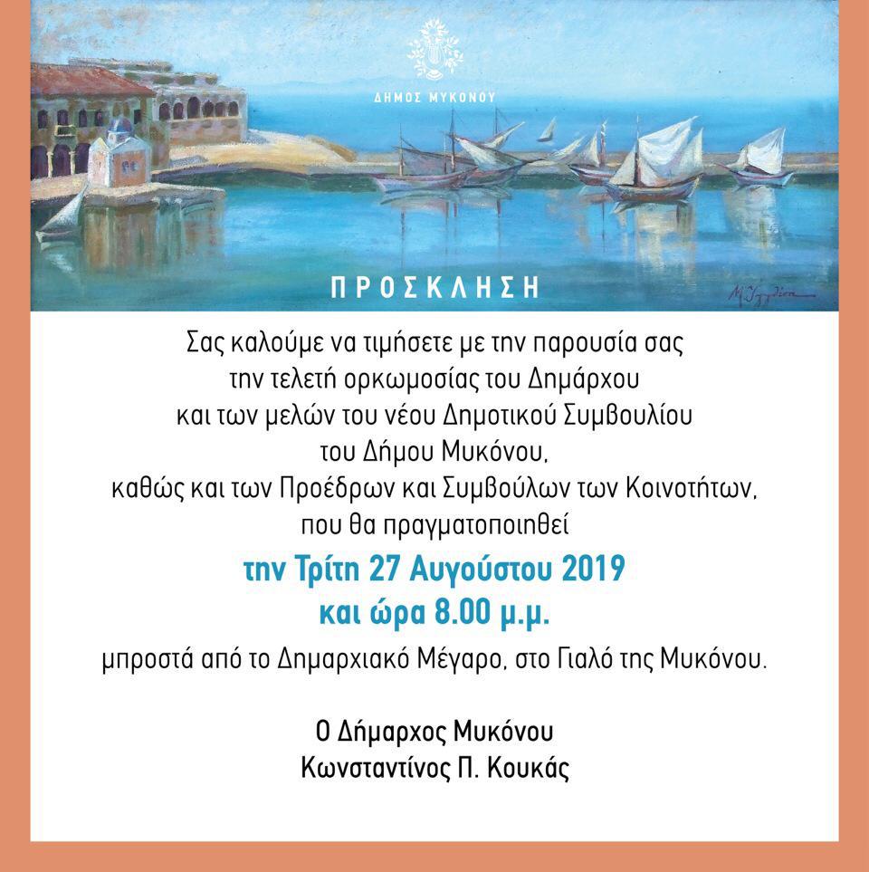 Ο Δήμος Μυκόνου σας προσκαλεί στην τελετή ορκωμοσίας του Δημάρχου και των μελών του νέου Δημοτικού Συμβουλίου, καθώς και των Προέδρων και Συμβούλων των Κοινοτήτων, που θα πραγματοποιηθεί την Τρίτη 27 Αυγούστου 2019 και ώρα 20:00, μπροστά από το Δημαρχιακό Μέγαρο, στο Γιαλό της Μυκόνου.