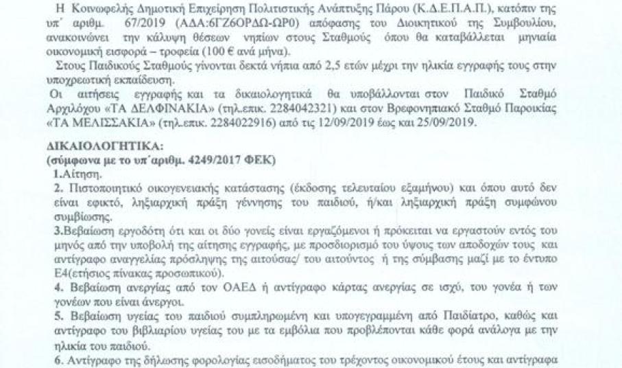 Ο Δήμος Πάρου ανακοινώνει το πρόγραμμα εγγραφών των νηπίων, για το σχολικό έτος 2019-2020.
