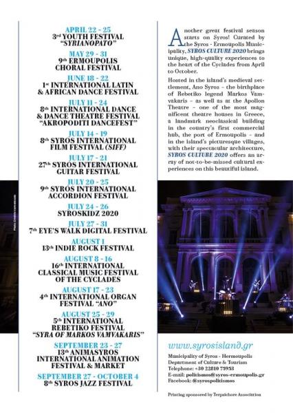 Συναυλίες με καταξιωμένους καλλιτέχνες, θεατρικές παραστάσεις, εικαστικές εκθέσεις, εκδηλώσεις για παιδιά θα σας ταξιδέψουν στον κόσμο της τέχνης, του πολιτισμού και των γραμμάτων σε μία διαδρομή από την Άνω Σύρο του Ρεμπέτικου ως το Ιστορικό Θέατρο Απόλλων στη νεοκλασική Ερμούπολη και τα γραφικά χωριά του νησιού, όπου κάτοικοι και επισκέπτες θα ζήσουν μια αξέχαστη πολυπολιτισμική εμπειρία. Οι συγκεκριμένες εκδηλώσεις εντάσσονται στη γενικότερη στρατηγική του Δήμου για την προσέλκυση επισκεπτών με ειδικά ενδιαφέροντα.