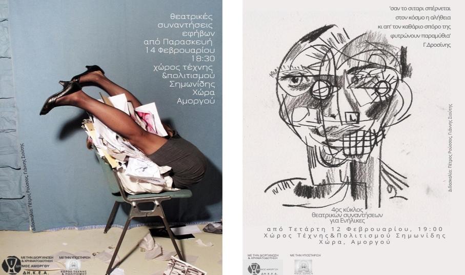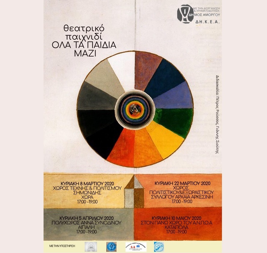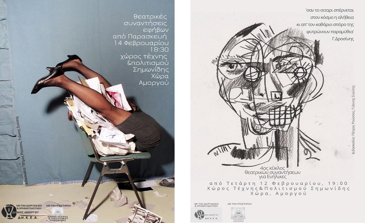 Τα θεατρικά εργαστήρια πραγματοποιούνται με την χρηματοδότηση της ΔΗ.Κ.Ε.Α. Αμοργού και τα μαθήματα είναι ανοιχτά προς όλους.