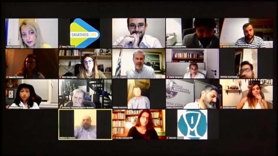 Η τηλεδιάσκεψη πραγματοποιήθηκε μέσω της πλατφόρμας zoom, συντονιστής ήταν ο Πρόεδρος της ΕΝΑ κ. Νεκτάριος Καλαντζής και μεταδόθηκε ζωντανά από το διαδικτυακό κανάλι του Skiathos Life.
