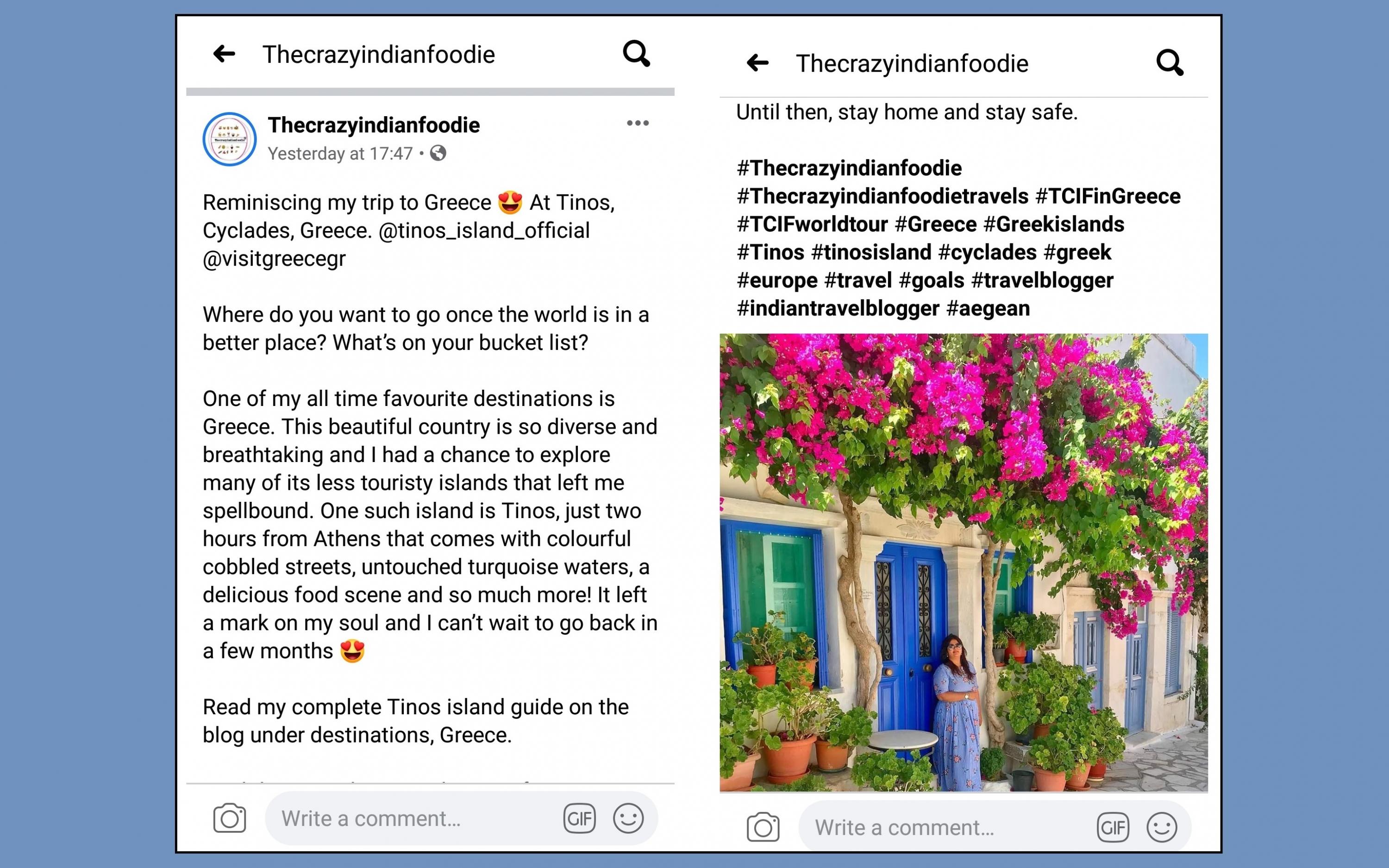 Νέα ανάρτηση με την οποία εκθειάζει τις ομορφιές της Τήνου έκανε η Ινδή Travel blogger κυρία Devashree Sanghvi, (www.thecrazyindianfoodie.com ), με πάνω από 300K followers σε Instagram, Facebook, Tik Tok και Twitter. Η γνωστή δημοσιογράφος, είχε επισκεφτεί το νησί και με ευχαρίστηση ανταποκρίθηκε στην προσπάθεια του Δήμου για τη διατήρηση ενεργών επαφών με τις αγορές του εξωτερικού, προσκαλώντας τους αναγνώστες της να επισκεφθούν τη "Μούσα του Αιγαίου
