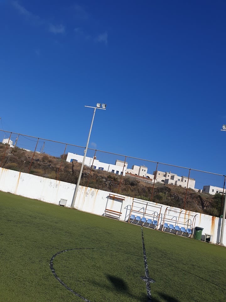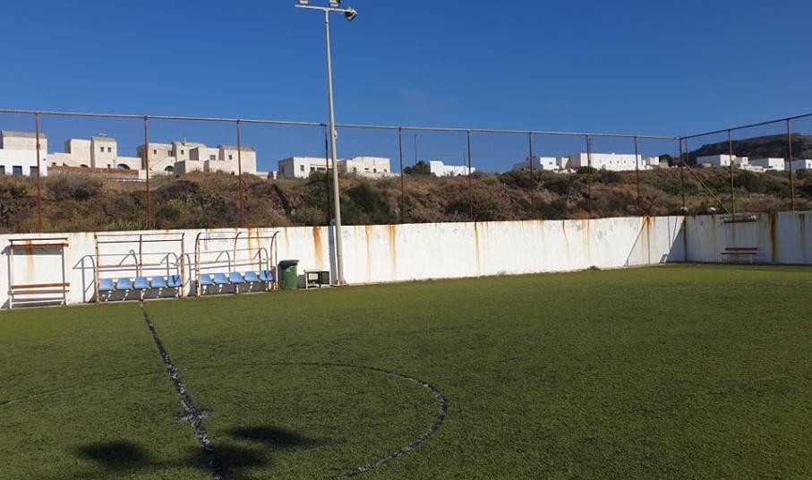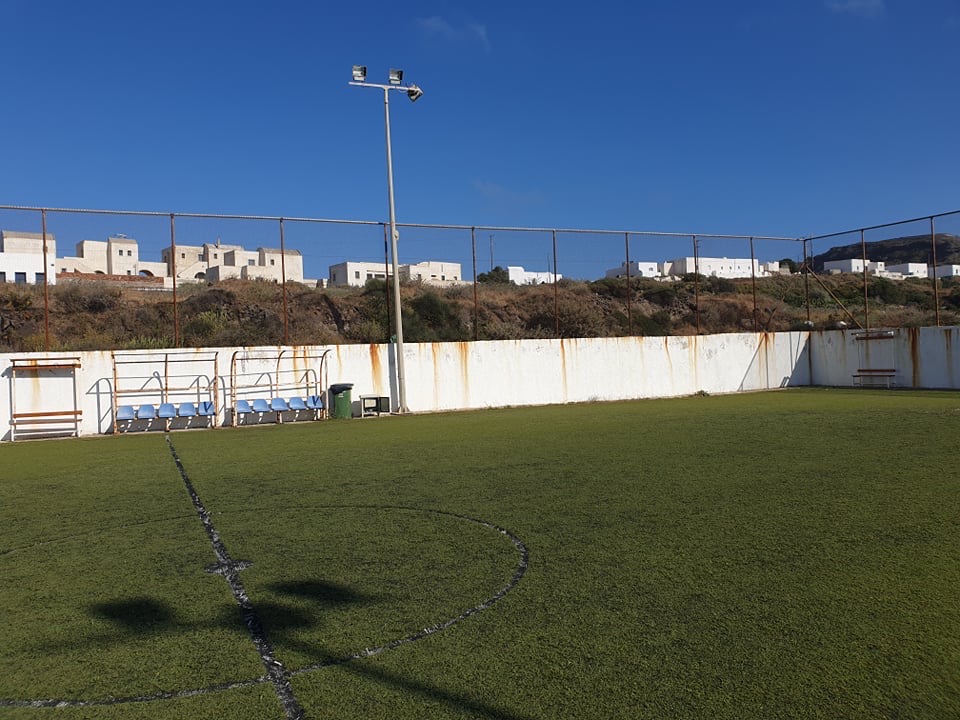Το γήπεδο 5 επι 5,το μοναδικό της Θηρασια, ήταν εγκαταλελειμένο χωρις καμμία συντήρηση στα ορια της επικινδυνότητας για τα παιδιά και τους κατοικους που το χρησιμοποιούσαν.