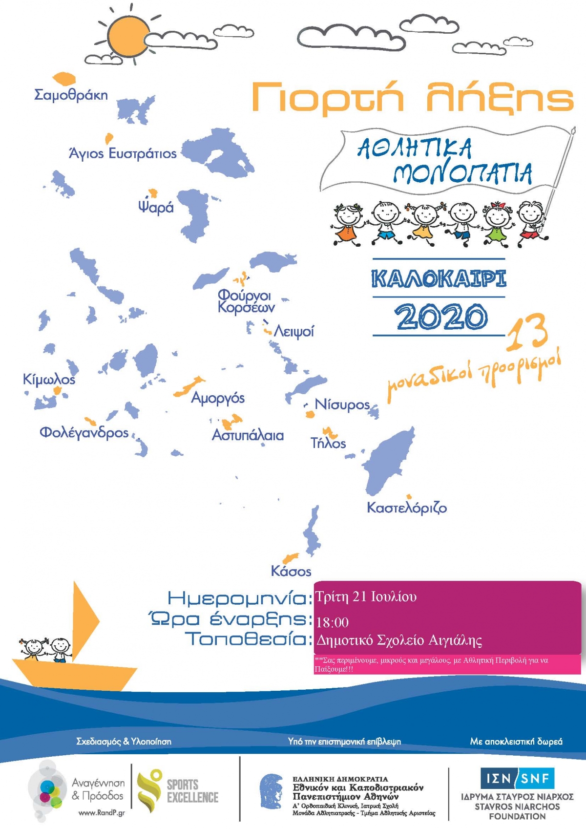 Με υπερηφάνεια ο Δήμος Αμοργού ανακοινώνει πως το πρόγραμμα «Αθλητικά Μονοπάτια» ολοκληρώθηκε και φέτος πετυχαίνοντας στο ακέραιο το σκοπό του και γιορτάζει τη λήξη του με μια ιδιαίτερη εκδήλωση αθλητισμού και χαράς η οποία θα πραγματοποιηθεί την Τρίτη 21 Ιουλίου 2020, στις 18:00, στο Δημοτικό Σχολείο Αιγιάλης.