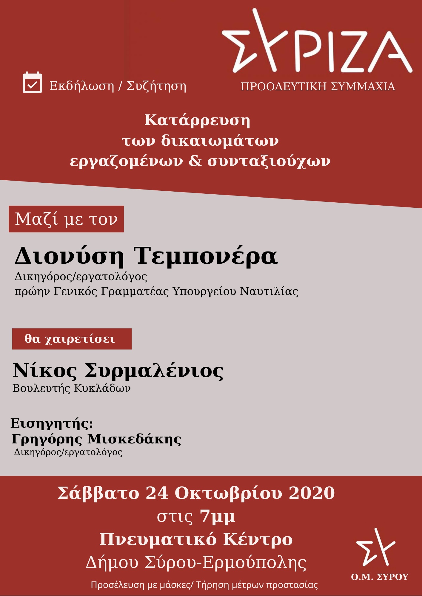 Σ’ αυτό το περιβάλλον, ο ΣΥΡΙΖΑ-Προοδευτική Συμμαχία Σύρου, διοργανώνει πολιτική εκδήλωση ενημέρωσης