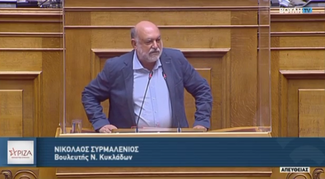 Η πρόταση μομφής ήρθε να απαντήσει σε μία κυνική, ανάλγητη πολιτική, που υλοποιεί μέσα στα πλαίσια μιας τριπλής κρίσης -υγειονομικής, οικονομικής και εθνικής- η Κυβέρνηση της Νέας Δημοκρατίας για να καταστρέψει εκατοντάδες χιλιάδες μικρομεσαίους και φυσικά πρόσωπα, τα οποία τα υποχρεώνει να μπουν σε καθεστώς πτώχευσης και τα εξομοιώνει με τις επιχειρήσεις. Και, μάλιστα, όχι μόνο τα βάζει σε καθεστώς πτώχευσης, που σημαίνει ρευστοποίηση της κινητής και ακίνητης περιουσίας για να χάσουν ό,τι έχουν και δεν έχουν, αλλά θα χάσουν και τα σπίτια τους μετά από δωδεκαετή παραχώρηση και υποχρέωση ενοικίου σε έναν ιδιωτικό φορέα  που δημιουργείται. Διότι για να μπορέσει μετά ο ευάλωτος οφειλέτης να πάρει το σπίτι του, θα πρέπει να πληρώσει στην εμπορική αξία μετά από δώδεκα χρόνια, χωρίς να μετράνε τα ποσά τα οποία έχει καταβάλει και πριν μπει στη 12ετή αυτή περίοδο ενοικίου, καθώς και τα ενοίκια τα οποία έχει δώσει. Αυτό επεσήμανε, μεταξύ άλλων, ο βουλευτής Κυκλάδων Νίκος Συρμαλένιος, μιλώντας στην Ολομέλεια της Βουλής, κατά τη διαδικασία συζήτησης πρότασης δυσπιστίας που κατέθεσε ο ΣΥΡΙΖΑ κατά του υπουργού Οικονομικών Χρήστου Σταϊκούρα. Γι’ αυτό, όπως τόνισε ο Ν. Συρμλένιος, χρειάζεται αλλαγή πορείας της χώρας και το σύνολο των δημοκρατικών δυνάμεων πρέπει να συνασπιστεί, για να υπάρξει πραγματικά αυτή η αλλαγή πορείας της χώρας.