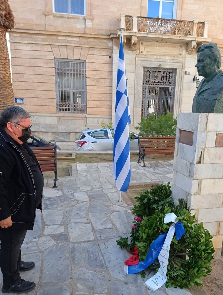 Στην προτομή του Σπύρου Μουστακλή, που βασανίστηκε άγρια στα κρατητήρια του ΕΑΤ-ΕΣΑ, κατέθεσε σήμερα στεφάνι αντιπροσωπεία της Οργάνωσης Μελών ΣΥΡΙΖΑ-Προοδευτική Συμμαχία Σύρου, διαβάστηκαν τα ονόματα των νεκρών της εξέγερσης του Πολυτεχνείου και τηρήθηκε ενός λεπτού σιγή.