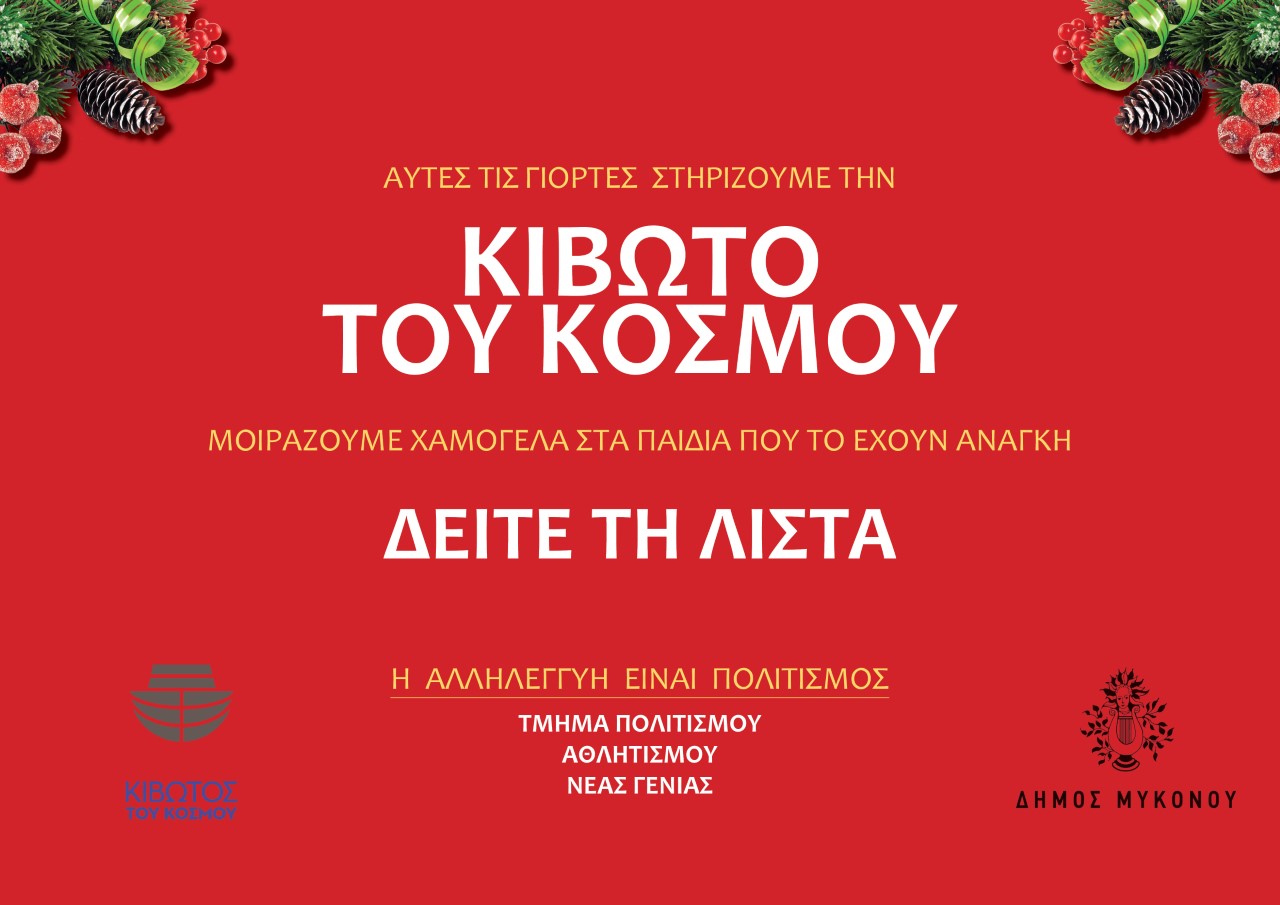 Σε μία έμπρακτη πράξη αλληλεγγύης και στήριξης όσων πραγματικά έχουν ανάγκη, το Τμήμα Πολιτισμού, Αθλητισμού και Νέας Γενιάς του Δήμου Μυκόνου αναλαμβάνει την πρωτοβουλία να συγκεντρώσει τρόφιμα και απαραίτητα είδη οικιακής και ατομικής υγιεινής για τα παιδιά και την Κιβωτό του Κόσμου.
