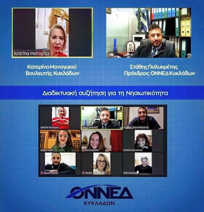 Με επιτυχία πραγματοποιήθηκε το Σάββατο 19 Δεκεμβρίου 2020 συζήτηση της ΟΝΝΕΔ Κυκλάδων με την Βουλευτή Κυκλάδων κ. Κατερίνα Μονογυιού με θέμα την Νησιωτικότητα. Μια συζήτηση η οποία είχε ως επίκεντρο τα «εξωτερικά» χαρακτηριστικά της "Νησιωτικότητας", δηλαδή τα μειονεκτήματα που εμφανίζουν τα νησιά έναντι της ηπειρωτικής χώρας δίνοντας έμφαση σε αναγκαίες και οριζόντιες πολίτικες για την άμβλυνση αυτών των μειονεκτημάτων.