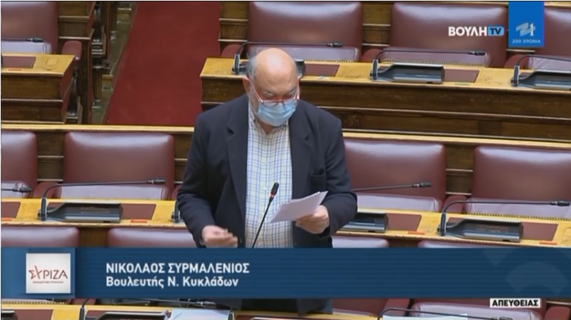 Ερωτήματα για τον τρόπο που θα γίνει ο εμβολιασμός των κατοίκων στις διαφορετικές κατηγορίες νησιών, καθώς και για την επάρκεια σε απαραίτητο για τον εμβολιασμό εξοπλισμό και προσωπικό (γιατροί, αναισθησιολόγοι κ.ά.) έθεσε ο βουλευτής Κυκλάδων Νίκος Συρμαλένιος στον Αναπληρωτή Υπουργό Υγείας Βασίλη Κοντοζαμάνη, κατά τη συζήτηση επίκαιρης ερώτησης του βουλευτή με θέμα τον εμβολιασμό στα νησιά.