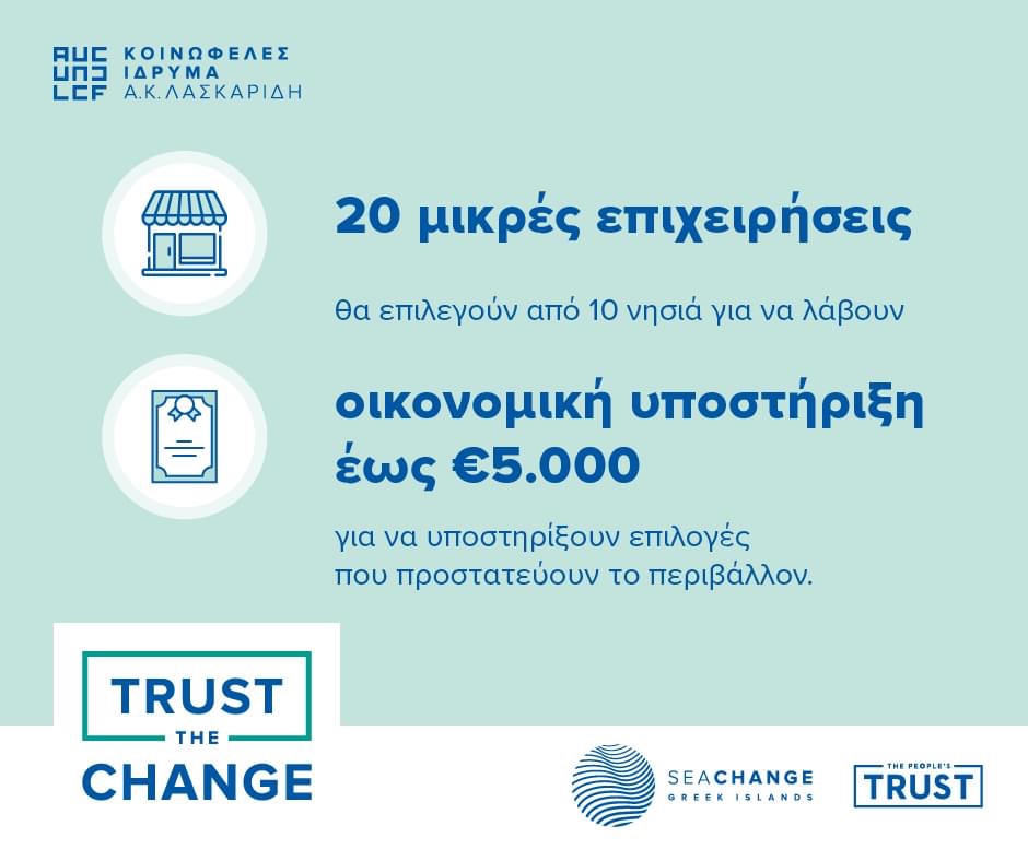 Στο πλαίσιο του προγράμματος “SeaChange Greek Islands”, το Κοινωφελές Ίδρυμα Αθανασίου Κ. Λασκαρίδη σε συνεργασία με τον μη κερδοσκοπικό οργανισμό “The People’s Trust” ανακοινώνουν το νέο πρόγραμμα “TRUST THE CHANGE: Ένα νέο πρόγραμμα υποστήριξης για περιβαλλοντικά υπεύθυνες επιχειρήσεις”, με στόχο την ενδυνάμωση της μικροεπιχειρηματικότητας και της τοπικής οικονομίας με τρόπο βιώσιμο και επωφελή για το περιβάλλον.