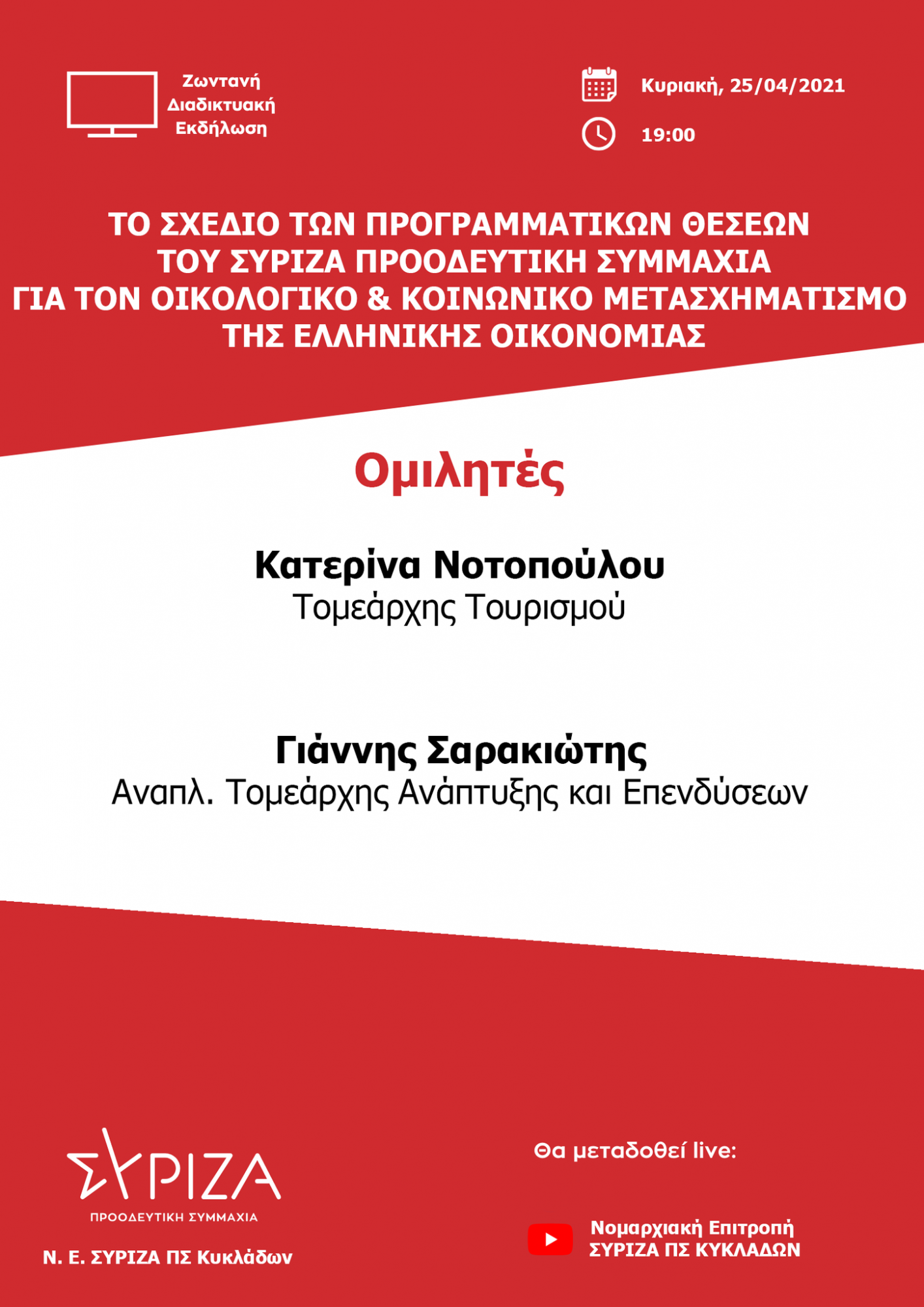 Στο πλαίσιο της πανελλαδικής παρουσίασης και συζήτησης των προγραμματικών θέσεων του ΣΥΡΙΖΑ-ΠΣ, η Νομαρχιακή Επιτροπή Κυκλάδων ξεκινά τη διαβούλευση με την κοινωνία και τους φορείς της και διοργανώνει την Κυριακή 25 Απριλίου στις 19:00 την πρώτη διαδικτυακή εκδήλωση – συζήτηση με θέμα «Οι προγραμματικές θέσεις του ΣΥΡΙΖΑ-Προοδευτική Συμμαχία για τον οικολογικό και κοινωνικό μετασχηματισμό της ελληνικής οικονομίας».