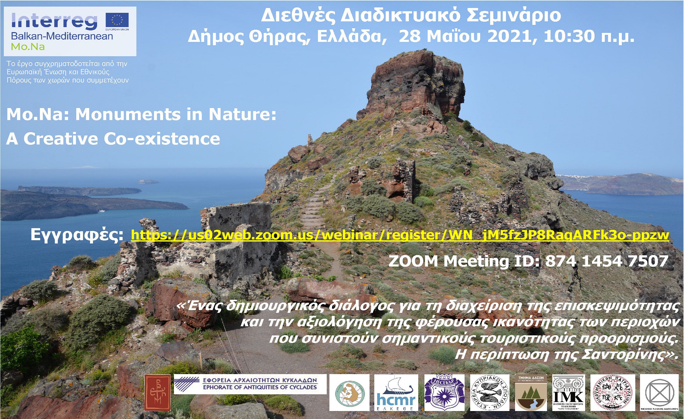Ο Δήμος Θήρας σας προσκαλεί στο Εργαστήριο – Διεθνές Διαδικτυακό Σεμινάριο (Webinar) που διοργανώνει στο πλαίσιο του έργου Mo.Na (Monuments in Nature: A creative Co-existence), με θέμα «Ένας δημιουργικός διάλογος για τη διαχείριση της επισκεψιμότητας και την αξιολόγηση της φέρουσας ικανότητας των περιοχών που συνιστούν σημαντικούς τουριστικούς προορισμούς. Η περίπτωση της Σαντορίνης».