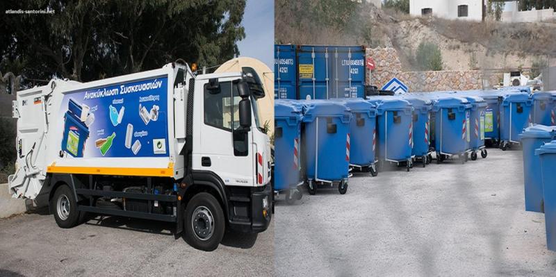 Η συγκεκριμένη ανάθεση αφορά και στην αποκομιδή των ανακυκλώσιμων. Συγκεκριμένα η διακήρυξη αναφέρει, ότι «η υπηρεσία αφορά εργασίες αποκομιδής ανακυκλώσιμων υλικών κατά την χειμερινή και θερινή περίοδο με την απασχόληση του κατάλληλου μηχανολογικού εξοπλισμού και έμπειρου προσωπικού (εργάτες, οδηγοί) σε όλες τις Δημοτικές και Τοπικές Κοινότητες Δήμου Θήρας πλην της Τ.Κ. Θηρασίας. Ο Ανάδοχος θα διαθέσει των εξοπλισμό και το προσωπικό που είναι απαραίτητο για την επάνδρωση των οχημάτων που θα διατεθούν για την εκτέλεση των εργασιών αποκομιδής ανακυκλώσιμων απορριμμάτων. Για τα απορριμματοφόρα οχήματα θα απασχολούνται ένας οδηγός και δύο εργάτες. Οι ανωτέρω εργάτες θα φροντίζουν την περισυλλογή των ανακυκλώσιμων απορριμμάτων και την φόρτωση τους στο απορριμματοφόρο από όλους τους μπλε κάδους. Οι εργάτες της Αναδόχου με αποκλειστική τους ευθύνη θα επαναφέρουν τους κάδους στις ορισμένες από τον Δήμο θέσεις. Το όχημα και το προσωπικό που το στελεχώνει θα απασχολούνται κατά τη θερινή περίοδο καθημερινά επτά ημέρες την εβδομάδα και κατά τη χειμερινή περίοδο έξι φορές την εβδομάδα εκτός Κυριακής».