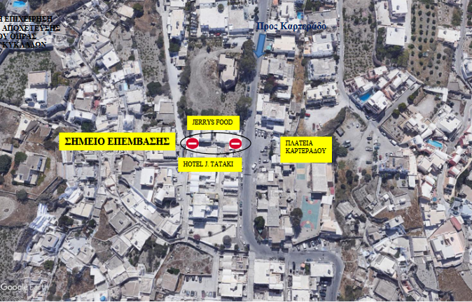 Η Δ.Ε.Υ.Α. Θήρας γνωστοποιεί την απαγόρευση της κυκλοφορίας στην περιοχή του Καρτεράδου και συγκεκριμένα στο δρομάκι ανάμεσα στο Jerrys Food και Tataki Hotel.