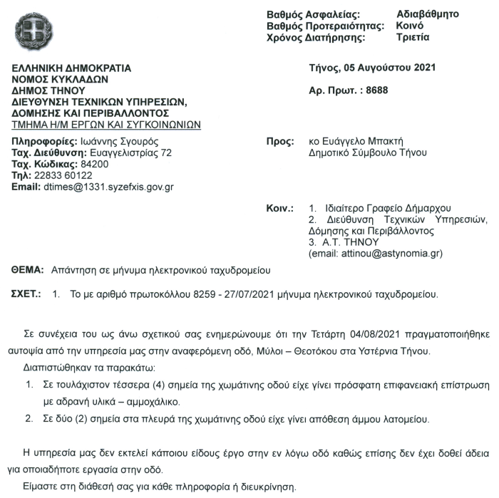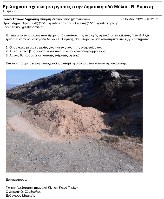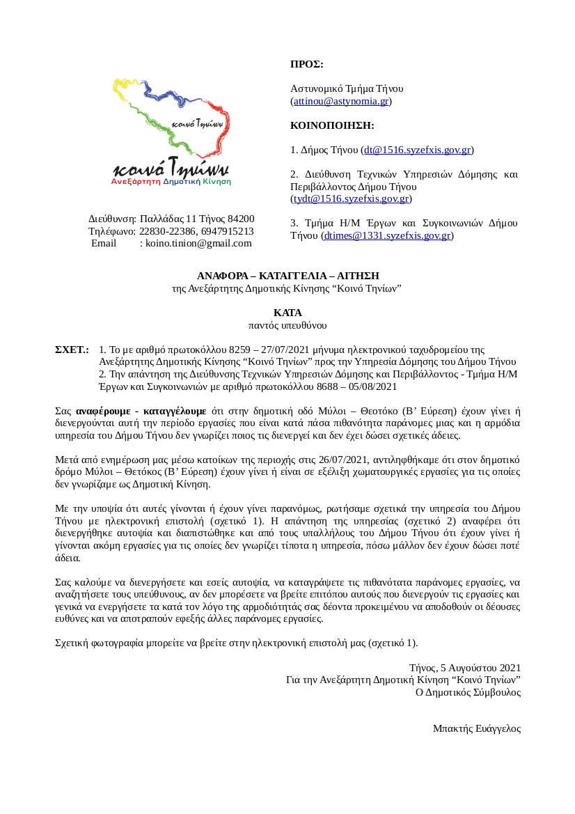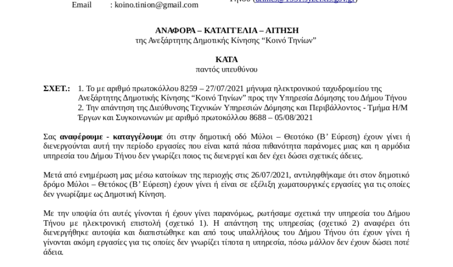 Η Ανεξάρτητη Δημοτική κίνηση "Κοινό Τηνίων" μετά από ένα σχετικό ερώτημα προς τις υπηρεσίες του Δήμου και την σχετική απάντηση της υπηρεσίας, κατέθεσε σήμερα ηλεκτρονικά μια αναφορά - καταγγελία - αίτηση στο Αστυνομικό Τμήμα Τήνου προκειμένου να διερευνηθεί ποιος διενεργεί εργασίες χωρίς άδεια στον δημοτικό δρόμο που ενώνει τους Μύλους Υστερνίων με τον ναό της Β' Εύρεσης.