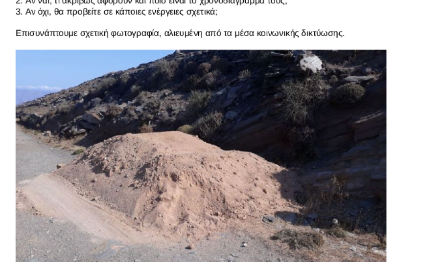 Συγκεκριμένα, μετά από αυτοψία της υπηρεσίας του Δήμου διαπιστώθηκε ότι έχει γίνει επιφανειακή επίστρωση με αμμοχάλικο σε τέσσερα (4) σημεία και απόθεση άμμου σε δύο (2) σημεία του δρόμου χωρίς καμία άδεια από τον Δήμο.