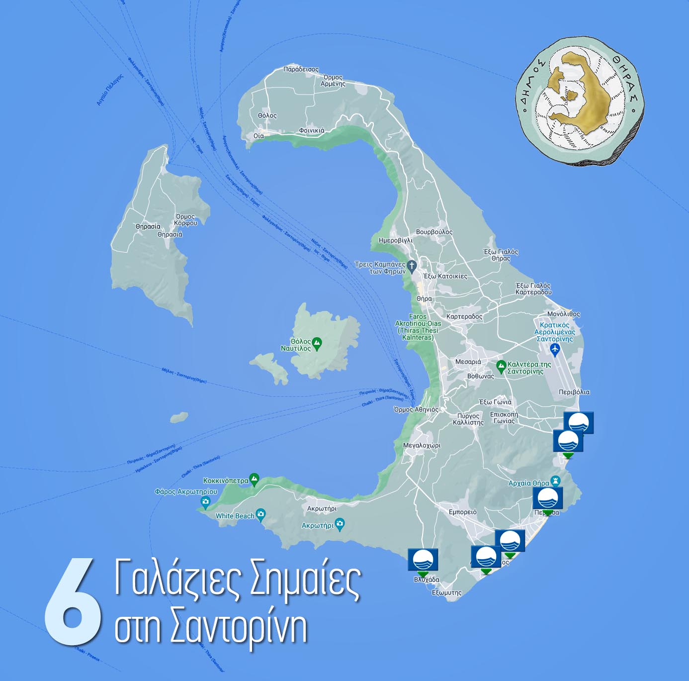 Ο Δήμος Θήρας διεκδίκησε με τις 6 υποψηφιότητες και πέτυχε και φέτος, την απονομή των σημαιών στις παραλίες του Αγίου Γεώργιου, την Βλυχάδα, τον Περίβολο και την Περίσσα στη νοτιοδυτική πλευρά του νησιού ενώ ανατολικά στην περιοχή Καμαρίου απονεμήθηκαν στο Καμάρι 1 και Καμάρι 2. Συνολικά στην Περιφερειακή Ενότητα Θήρας απονεμήθηκαν 9 σημαίες, 6 στον Δήμο Θήρας και 3 στον Δήμο Ιητών.