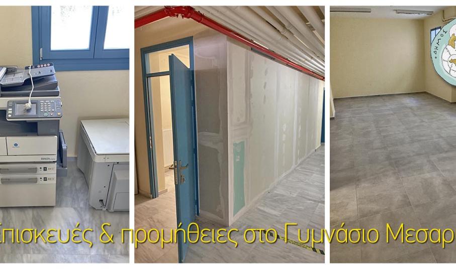 Συγκεκριμένα στο Γυμνάσιο Μεσαριάς πραγματοποιήθηκαν, διαμόρφωση νέων χωρών διδασκαλίας, αντικατάσταση δαπέδων και τοποθέτηση αντιολισθητικών πλακιδίων στις αίθουσες εργαστηρίων και αντικατάσταση πολυμηχανήματος.