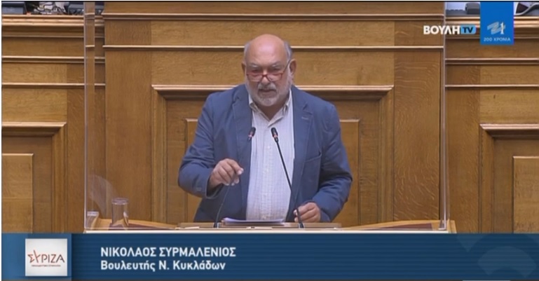 Την κυβερνητική απραξία στον τομέα πολιτικών για τον νησιωτικό χώρο κατήγγειλε από το βήμα της Βουλής ο βουλευτής Κυκλάδων Νίκος Συρμαλένιος, μιλώντας στην Ολομέλεια κατά τη συζήτηση του σχετικού νομοσχεδίου του Υπουργείου Ναυτιλίας και Νησιωτικής Πολιτικής, θέτοντας μια σειρά από ερωτήματα, που έμειναν αναπάντητα από την κυβέρνηση κατά τη συζήτηση που ακολούθησε. Ειδικότερα, ο Νίκος Συρμαλένιος ανέφερε χαρακτηριστικά: «Πρώτον, γιατί δεν υπερψηφίσατε όταν γινόταν η τελευταία προετοιμασία για τη Συνταγματική Αναθεώρηση που πήρε στην πρώτη ψηφοφορία διάταξη για την ιδιαιτερότητα στο νησιωτικό χώρο της διοίκησης; Ήταν πρόταση του συναδέλφου Αντώνη Συρίγου, που πήρε περίπου 170 ψήφους στην πρώτη ψηφοφορία. Στη δεύτερη ψηφοφορία ακυρώσατε αυτή τη διάταξη και δεν την ψηφίσατε, ενώ λέτε ότι υπερασπίζεστε τη νησιωτική πολιτική. Δεύτερον, γιατί καταργήσατε το χαρτοφυλάκιο του Αναπληρωτή Υπουργού Νησιωτικής Πολιτικής και αφήσατε αυτή την αρμοδιότητα μόνο στη Γενική Γραμματεία; Τρίτον, ποιες πολιτικές νησιωτικότητας εφαρμόσατε τα δυόμισι χρόνια που κυβερνάτε; Με εξαίρεση την αύξηση των κονδυλίων από 93 σε 138 εκατομμύρια για την επιδότηση των άγονων γραμμών, δηλαδή την επιδότηση των ακτοπλόων και των εφοπλιστών, ποια άλλη πολιτική εφαρμόσατε στα νησιά; Να μας πείτε συγκεκριμένα. Τέταρτον, ποια είναι η πολιτική σας απέναντι στην αύξηση των συντελεστών του ΦΠΑ, ένα θέμα στο οποίο βασίσατε όλη σας την προπαγάνδα τα προηγούμενα χρόνια, όπου θυμίζω ότι ήταν μια διάταξη που περιλαμβανόταν στο mail Χαρδούβελη, για να μην ξεχνιόμαστε και που έγινε απαίτηση των δανειστών το καλοκαίρι του 2015. Ποιες, λοιπόν, νησιωτικές πολιτικές εφαρμόσατε;»