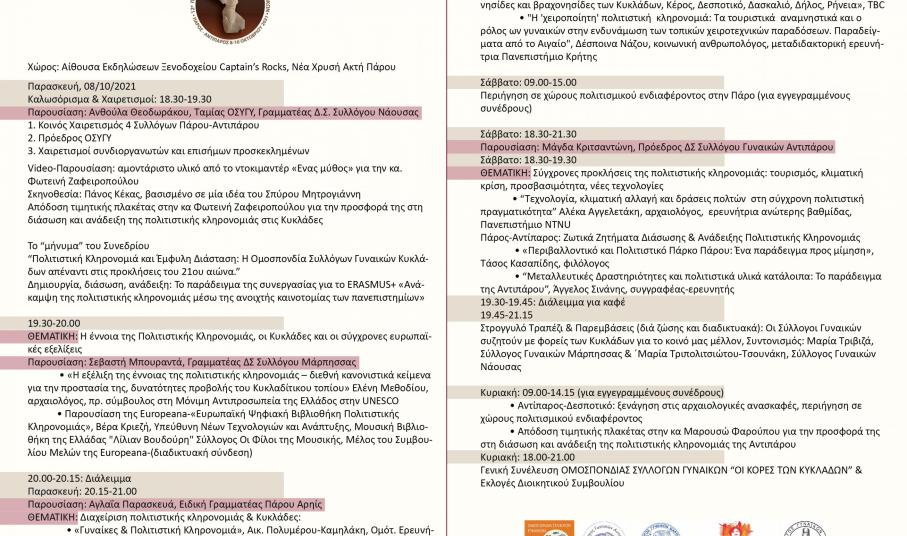 Το έμπρακτο ενδιαφέρον για την νέα πολιτιστική δημιουργία καθώς και την διάσωση και την ανάδειξη της πολιτισμικής κληρονομιάς των Κυκλάδων αποτυπώνεται στο πρόγραμμα του 12ο Πανκυκλαδικού Συνέδριου της Ομοσπονδίας Συλλόγων Γυναικών Κυκλάδων που διοργανώνεται στα νησιά της Πάρου και της Αντιπάρου από την Παρασκευή 8 έως την Κυριακή 10 Οκτωβρίου 2021. Θα υλοποιηθεί σε συνεργασία με τους 4 Συλλόγους Γυναικών της Περιφερειακής Ενότητας Πάρου-Αντιπάρου: Σύλλογος Γυναικών Αντιπάρου, Σύλλογος Γυναικών Νάουσας Πάρου, Σύλλογος Γυναικών Μάρπησσας και Σύλλογος Γυναικών Πάρου “Αρηίς”.