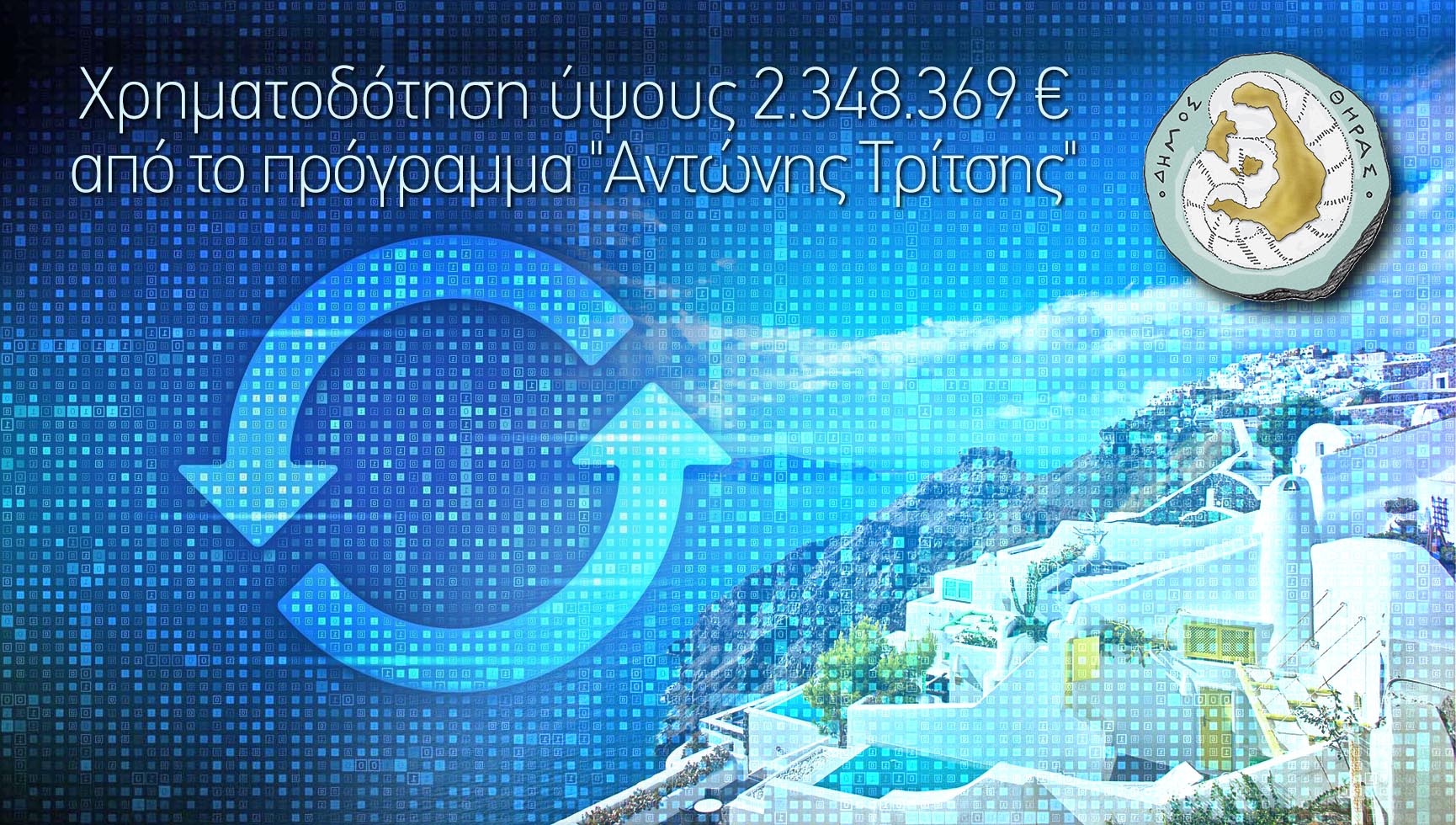 Χρηματοδότηση ύψους 2.348.369€ εξασφάλισε ο Δήμος Θήρας, από το πρόγραμμα "Αντώνης Τρίτσης" προκειμένου να υλοποιήσει ένα πρωτοποριακό και φιλόδοξο έργο, που μετατρέπει τη Σαντορίνη σε "έξυπνο" και βιώσιμο νησί.