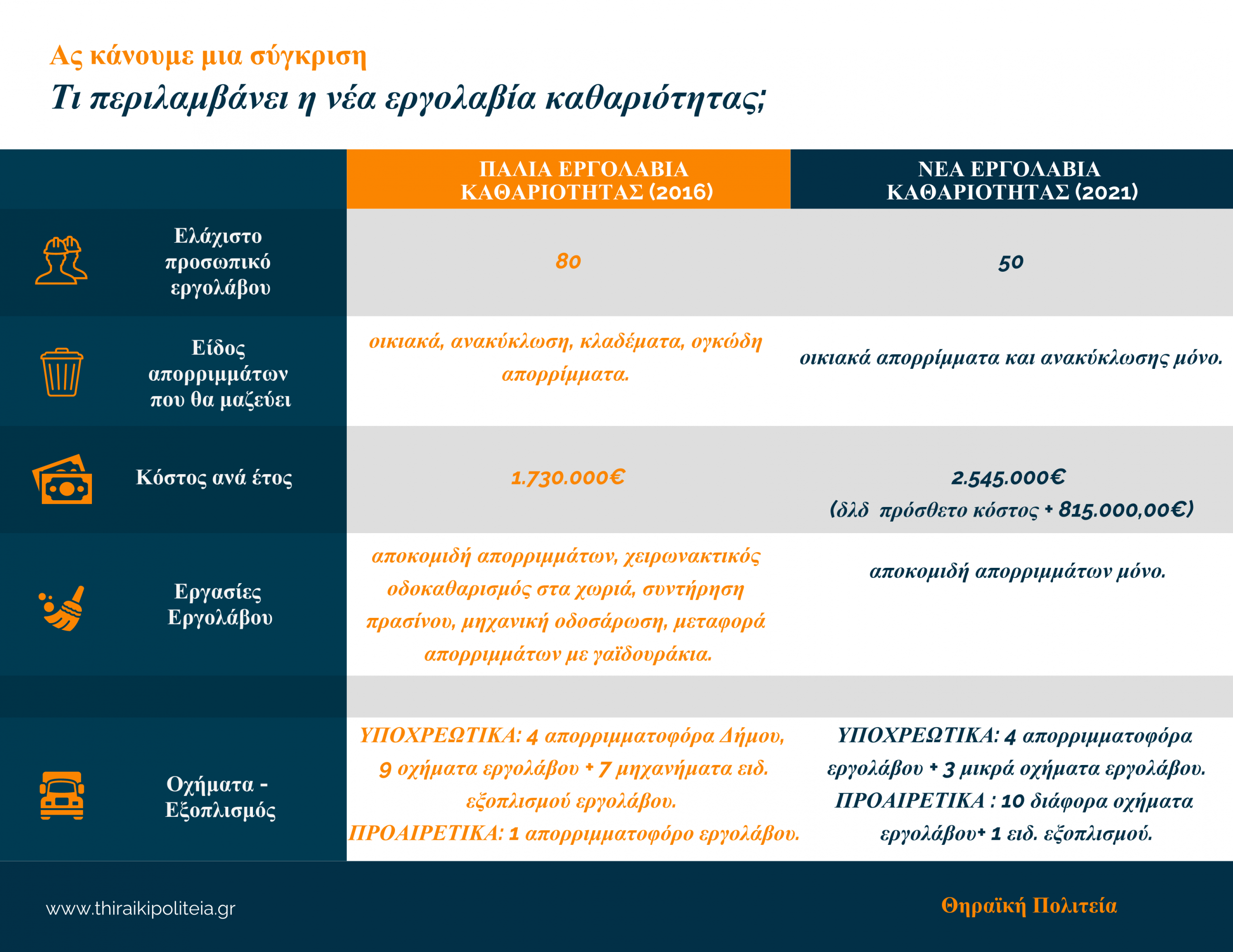 Στις 13 Ιουλίου 2021 με την 177/2021 απόφαση (ΑΔΑ: Ψ55ΘΩΡΝ-ΩΣΩ) της Οικονομικής Επιτροπής του Δήμου Θήρας, κατακυρώθηκε η δημοπράτηση της νέας εργολαβίας καθαριότητας με ποσό 5.090.000,00€ για δύο έτη. Παρόλο που η νέα εργολαβία είναι κατά 815.000,00€ ευρώ ακριβότερη κατ’ έτος για τους δημότες, περιλαμβάνει λιγότερες εργασίες από την προηγούμενη. Συγκεκριμένα η νέα εργολαβία δεν περιλαμβάνει: αποκομιδή ογκωδών απορριμμάτων, αποκομιδή υπολειμμάτων από κλαδέματα, μεταφορά απορριμμάτων με υποζύγια, χειρωνακτικό οδοκαθαρισμό στα χωριά, συντήρηση πρασίνου και καθαρισμό στις άκρες των δρόμων, μηχανική οδοσάρωση.