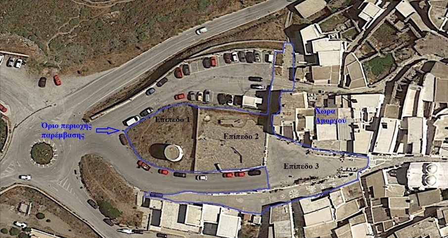 Τα ταξί θα σταθμεύουν επί της επικλινούς δημοτικής οδού, πριν το νέο χώρο πλατείας. Με αυτό τον τρόπο η υφιστάμενη έκταση θα αποσυμφορηθεί από τα οχήματα και θα μετατραπεί σε έναν ευχάριστο δημόσιο χώρο μετάβασης στον οικισμό της Χώρας. Όλη η εν λόγω έκταση θα διαστρωθεί επίσης με ντόπιες ακανόνιστες πλάκες, ενώ κεντρικά του νέου χώρου της πλατείας θα φυτευθεί μεγάλο, με την διαμόρφωση κυκλικού παρτεριού και στα περιμετρικά παρτέρια θα φυτευθούν φυτά ανεμοθραύστες.