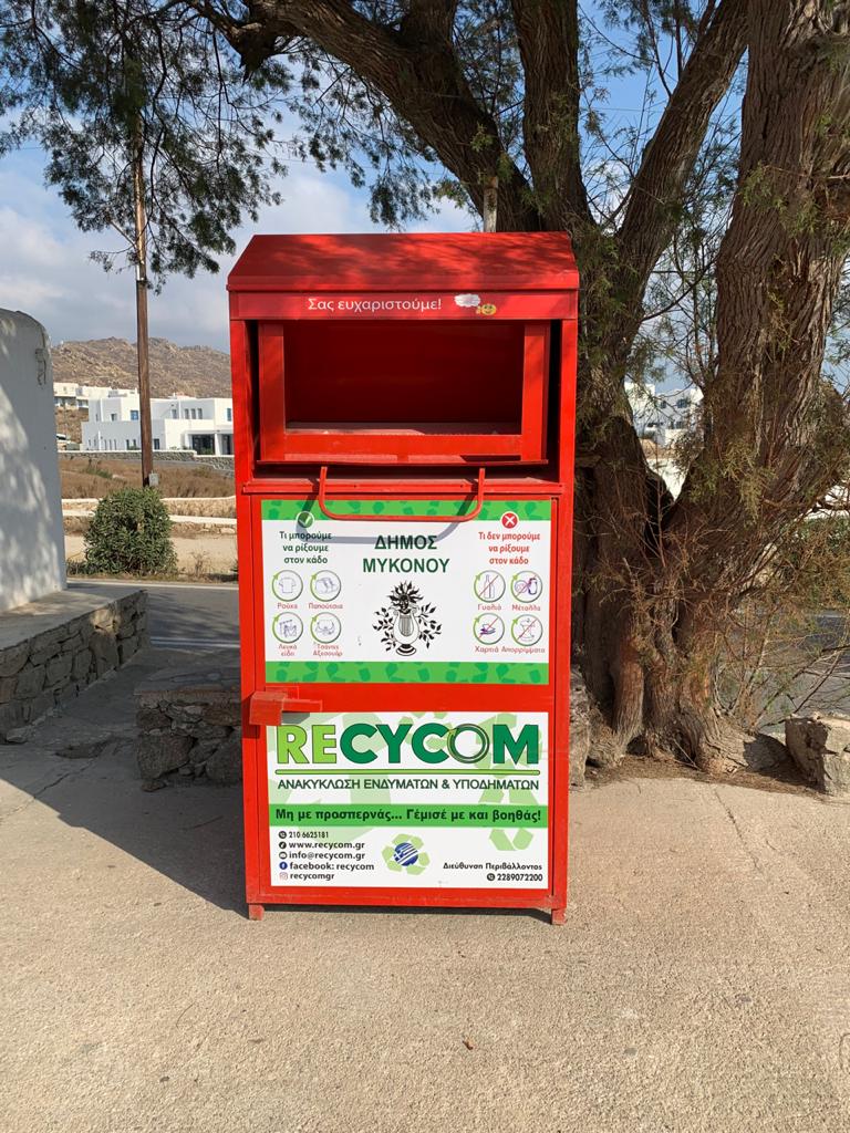 Στην τοποθέτηση δύο κόκκινων κάδων ανακύκλωσης ρούχων, υποδημάτων, και λευκών ειδών με στόχο τη μείωση των σύμμεικτων απορριμμάτων του νησιού προχώρησε ο Δήμος Μυκόνου, σε συνεργασία με την εταιρεία RECYCOM.