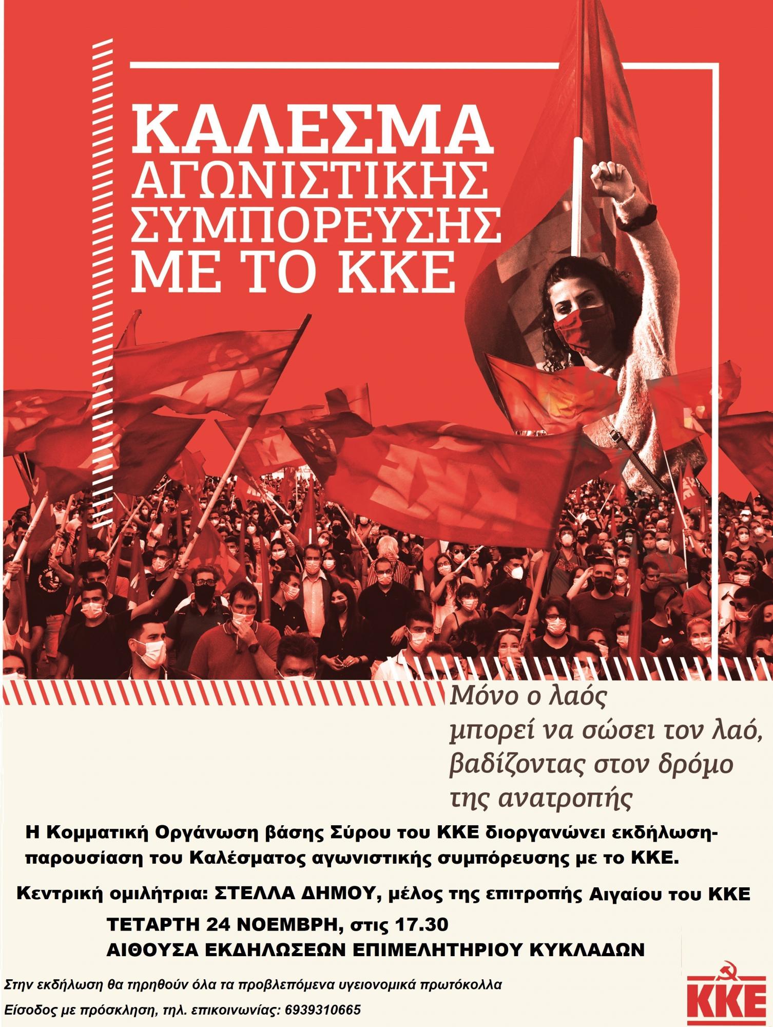 Πρόσκληση της ΚΟΒ Σύρου του ΚΚΕ για την εκδήλωση για την παρουσίαση του Καλέσματος αγωνιστικής συμπόρευσης με το ΚΚΕ, την Τετάρτη 24 Νοέμβρη στην αίθουσα εκδηλώσεων του επιμελητηρίου Κυκλάδων, στις 17.30.