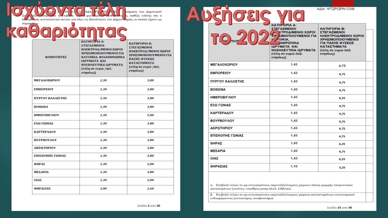 Στις 15 Νοεμβρίου 2021 με απόφαση της Οικονομικής Επιτροπής ψηφίστηκε η αύξηση των τελών καθαριότητας και ηλεκτροφωτισμού για το έτος 2022. Τα τέλη αυτά εισπράττονται και τακτοποιούνται λογιστικά σε έναν ξεχωριστό κουμπαρά του Δήμου, είναι ανταποδοτικά και επιστρέφουν στους Δημότες ως υπηρεσία καθαριότητας και ηλεκτροφωτισμού των δημόσιων χώρων.