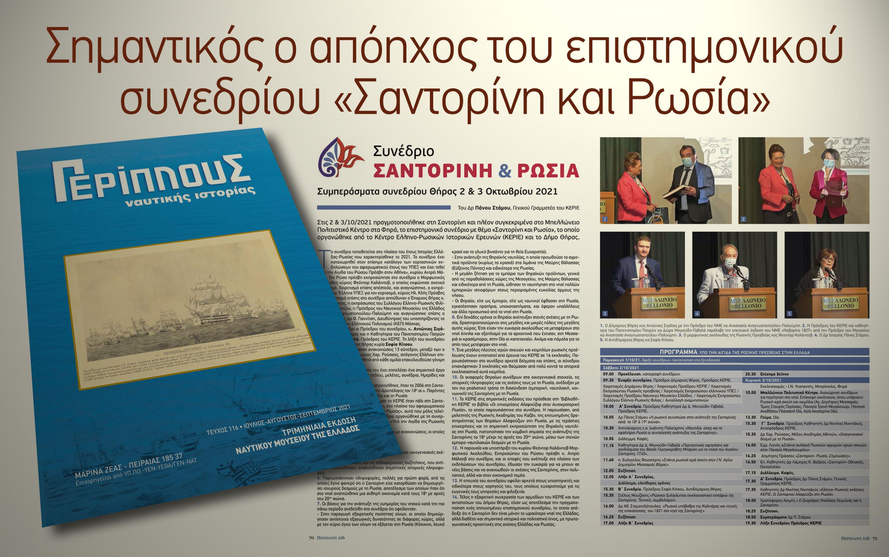 Σημαντικός ο απόηχος του επιστημονικού συνεδρίου με θέμα «Σαντορίνη και Ρωσία» που πραγματοποιήθηκε στην Σαντορίνη στις 2 και 3 Οκτωβρίου 2021 και οργανώθηκε από το Κέντρο Ελληνο-Ρωσικών Ιστορικών Ερευνών (ΚΕΡΙΕ) και το Δήμο Θήρας.