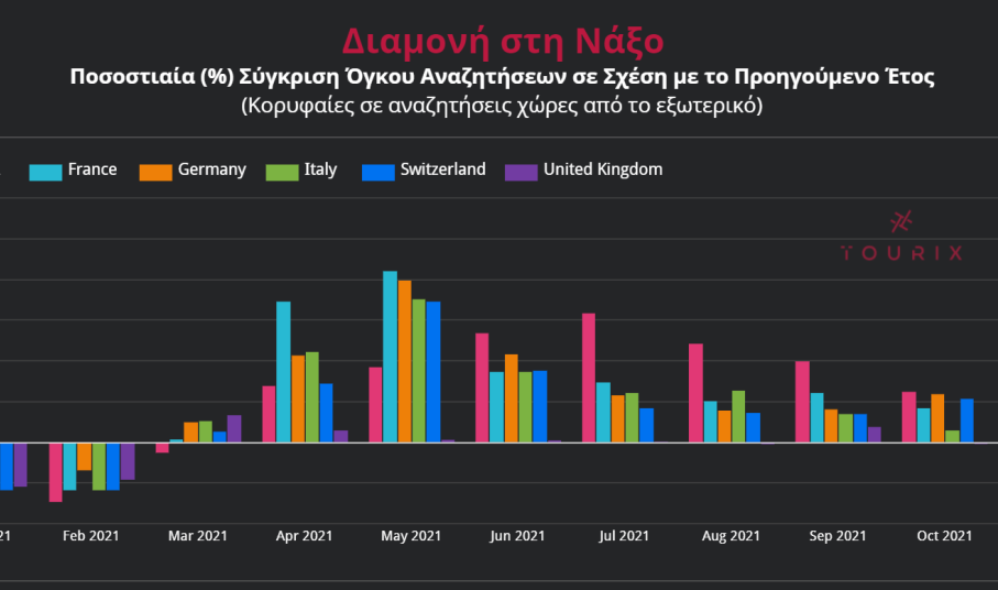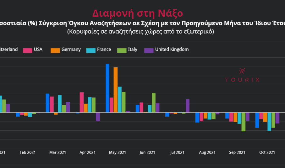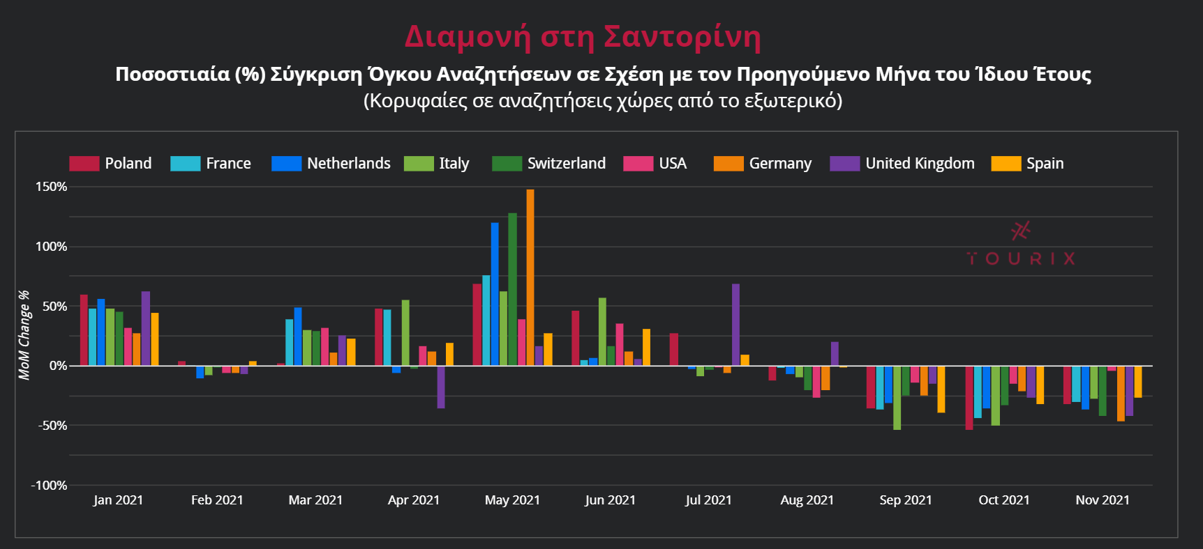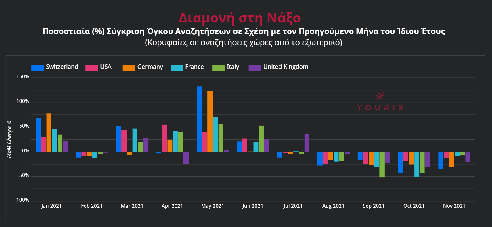 Τον Νοέμβριο του 2021 παρατηρούμε μια μείωση της τάξεως του 3% στις αναζητήσεις σε σχέση με τον Οκτώβριο 2021. Αυτό οφείλεται στο γεγονός ότι σε όλες τις χώρες υπήρξε μείωση των αναζητήσεων σε σχέση με τον Οκτώβριο του 2021. Πιο αναλυτικά, τον Νοέμβριο του 2021 σε σχέση με τον Οκτώβριο του 2021 παρατηρήθηκε μείωση των αναζητήσεων 35% από την Ελβετία, 32% από τη Γερμανία, 9% από τη Γαλλία, 8% από την Ιταλία και 22% από το Ηνωμένο Βασίλειο.