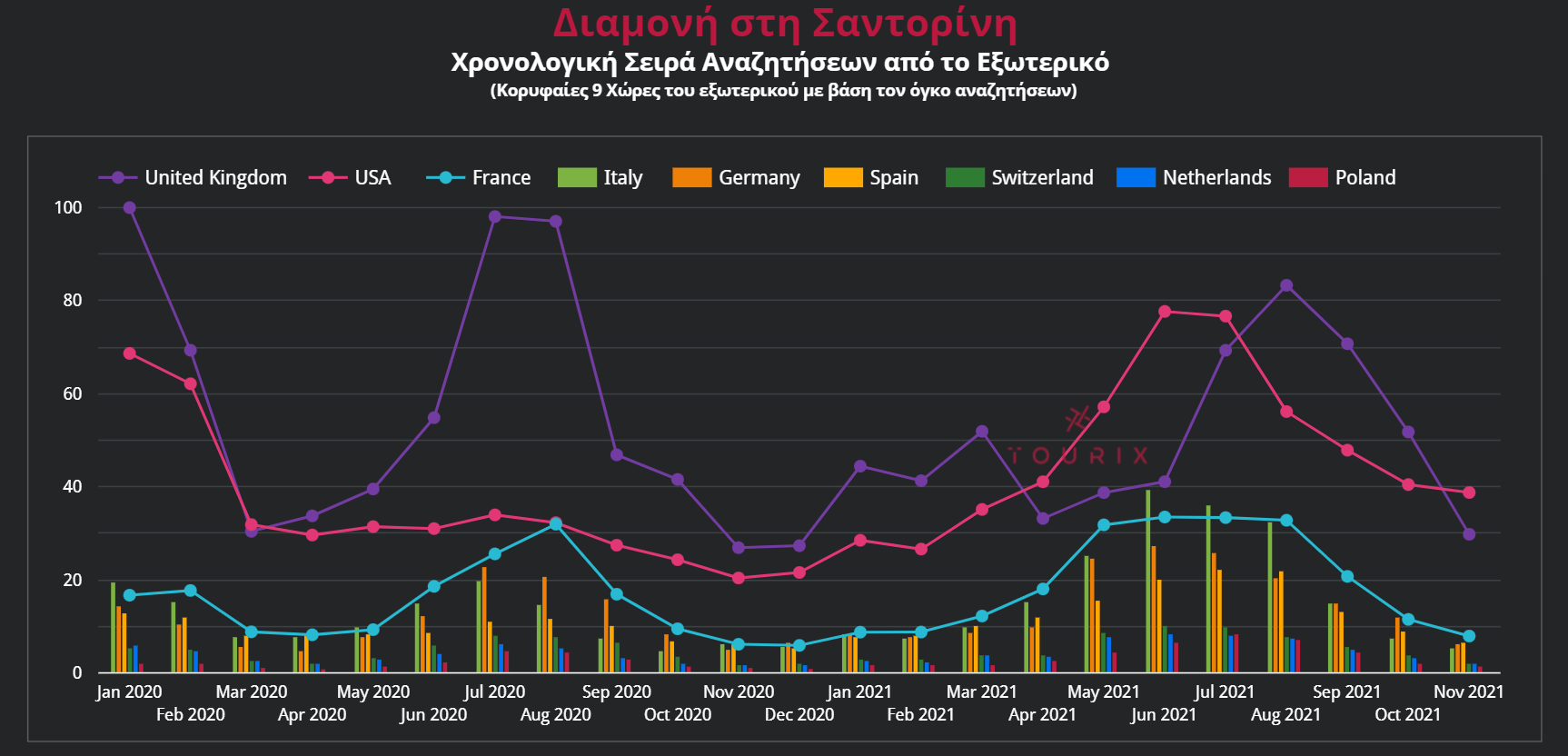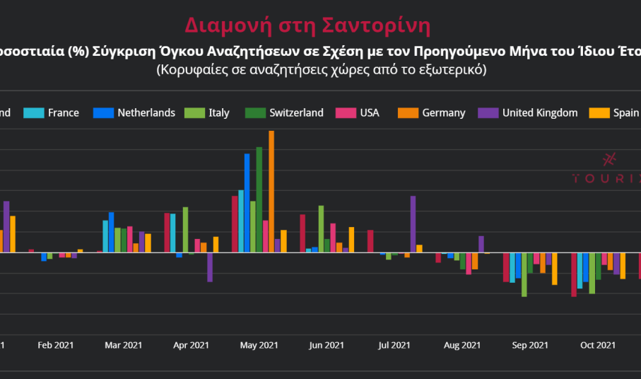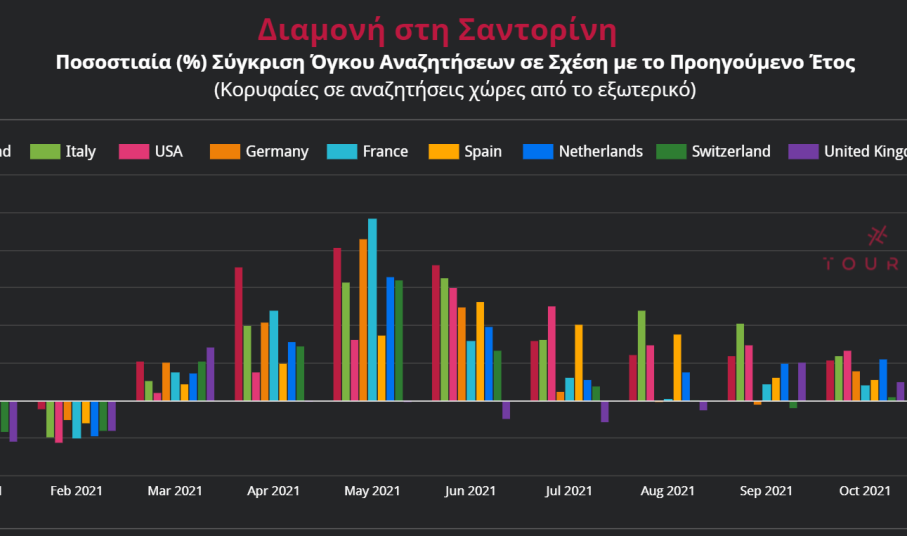 Συνολικά για το 2021, οις 3 τοπ χώρες στις διαδικτυακές αναζητήσεις για διαμονή στην Σαντορίνη είναι το Ηνωμένο Βασίλειο, οι ΗΠΑ και η Γαλλία όπως ήταν και για το 2020 με την ίδια σειρά.